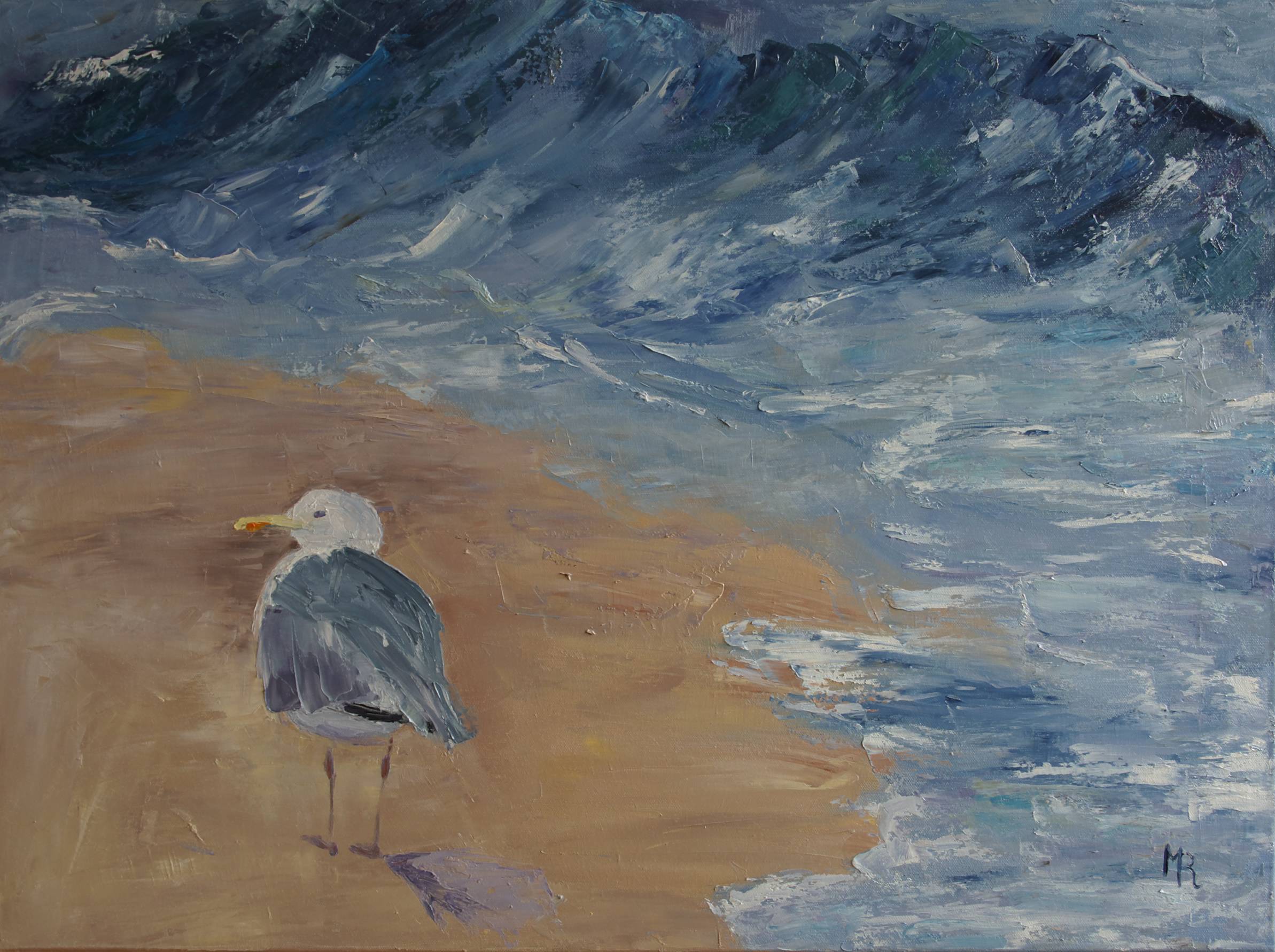 Na obrazie widzimy mewę stojącą na plaży, gdzie fale delikatnie uderzają o brzeg. Kolory są stonowane, dominują odcienie niebieskiego, szarości i beżu, które łączą się, tworząc spokojną, niemal melancholijną atmosferę. Mewa to główny bohater tego malowidła, z białymi piórami rozproszonymi nad szarym grzbietem. Morze jest niespokojne, z dynamicznymi pociągnięciami pędzla, które dodają obrazu ruchu, a jednocześnie kontrastują z nieruchomą postacią ptaka. Czujemy, że artysta używa techniki impasto, co daje teksturze obrazu wyrazistość i trójwymiarowość. Nastrojowy charakter dzieła sprawia, że odbiorca może poczuć się jakby sam znajdował się nad brzegiem morza w chłodny poranek. Może się zdawać, że mewa rozmyśla nad sensem życia, a nam towarzyszy poczucie nostalgii i zadumy. To tak, jakby czas się zatrzymał, a my jesteśmy świadkami ulotnej chwili peace. Dla dziecka, taki obraz może być po prostu opowieścią o mewie, która szuka śniadania. Każdy widzi w nim co innego, od refleksji po czystą radość z prostoty natury. Choć obraz jest statyczny, emanuje z niego głęboka emocja, skłaniając nas do zatrzymania się na chwilę i pomyślenia o małych cudach świata.