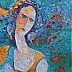 Nowoczesny obraz postać kobiety w stylu Modigliani, szpachelka malarska, impasto. Portret kobiety, olej na płótnie o wymiarach 60 x 80 cm w turkusach, żółciach i błękitach. Obraz ma grubą fakturę, która pięknie odbija światło i jest bardzo dekoracyjny.