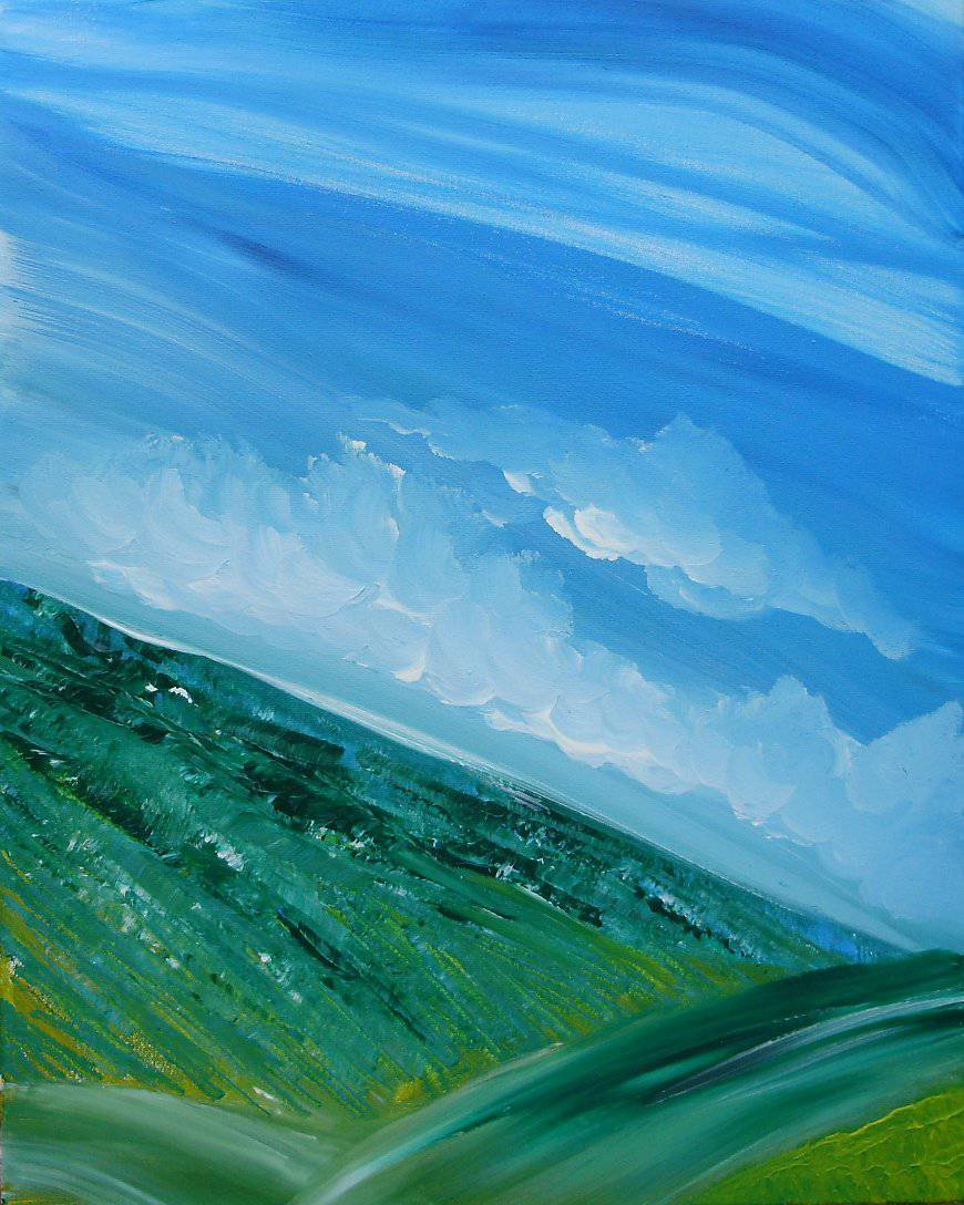 Na tym obrazie dominują dwa główne kolory: niebieski i zielony. Niebieskie niebo, pokryte miękkimi, puszystymi chmurami, rozciąga się na większą część płótna, tworząc wrażenie spokoju i przestrzeni. Zielone wzgórza poniżej zdają się falować, jakby unosiły się w rytm delikatnego wiatru. Kompozycja jest prosta, ale niezwykle ujmująca. Perspektywa prowadzi wzrok widza w dal, ku horyzontowi, gdzie chmury zdają się tańczyć na wietrze. Całość emanuje spokojem, ale i lekkością. Czujesz się, jakbyś mógł się tam przenieść i oto, hop, już sobie biegasz po tych wzgórzach! Artysta użył technik impasto, nakładając farbę grubymi pociągnięciami, co nadaje obrazowi wyraźnej faktury. Te dynamiczne pociągnięcia pędzlem przypominają ruchy ręki, jak w dziele malowanym z energią i pasją. Widz czuje swobodę i radość, jaką może dawać obcowanie z przyrodą. Ten "flow" artystyczny widać w swobodnych kształtach chmur, które na swój sposób opowiadają własne historie. Obraz może budzić w odbiorcy różne emocje, od nostalgii za spokojnymi chwilami na łonie natury po zachwyt nad pięknem świata. Osobiście, ten krajobraz przywodzi mi na myśl lato spędzone w górach, ciepło słońca na twarzy i beztroskie dni. Jedno jest pewne – taka sztuka ma moc przenoszenia nas w miejsca, gdzie codzienne troski tracą na znaczeniu.
