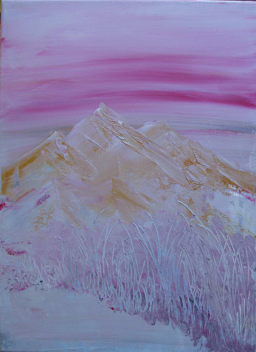 Obraz emanuje delikatnym urokiem pastelowych barw. Dominują tu odcienie różu przechodzące subtelnie w biel i lekkie złocienie. Na pierwszym planie delikatne linie przypominające trawy, które wiją się ku górze, prowadzą wzrok ku majestatycznym szczytom gór. Góry przypominają pokryte śniegiem wierzchołki, które toną w mglistym różowym niebie. Kompozycja jest zrównoważona, z wyraźnym podziałem na trzy poziomy: ziemny, górski i niebiański. Nastrój tego dzieła jest spokojny i kojący. Człowiek patrzy na to i czuje, że czas zwalnia. Czuję się jak w bajce, gdzie świat jest bardziej miękki i spokojny. Malarski styl to połączenie impresjonizmu z modernistycznym podejściem do kolorystyki. Artysta użył techniki impasto, tworząc fakturę, która przyciąga oko. Barwy i linie są płynne, co dodaje obrazowi dynamiki, mimo jego statycznej natury. Patrząc na ten obraz, można poczuć ciepło i nostalgię. Może przypominać o letnich porankach w górach, kiedy niebo ma ten magiczny, pinkish odcień. "A ja widzę tu góry jak z mojego snu!" powiedziałby z pewnością siedmiolatek. Ten obraz wprowadza ciepło do serca. Pozwala oderwać się od prozy codzienności i przenieść się w świat dziecięcych fantazji i marzeń.