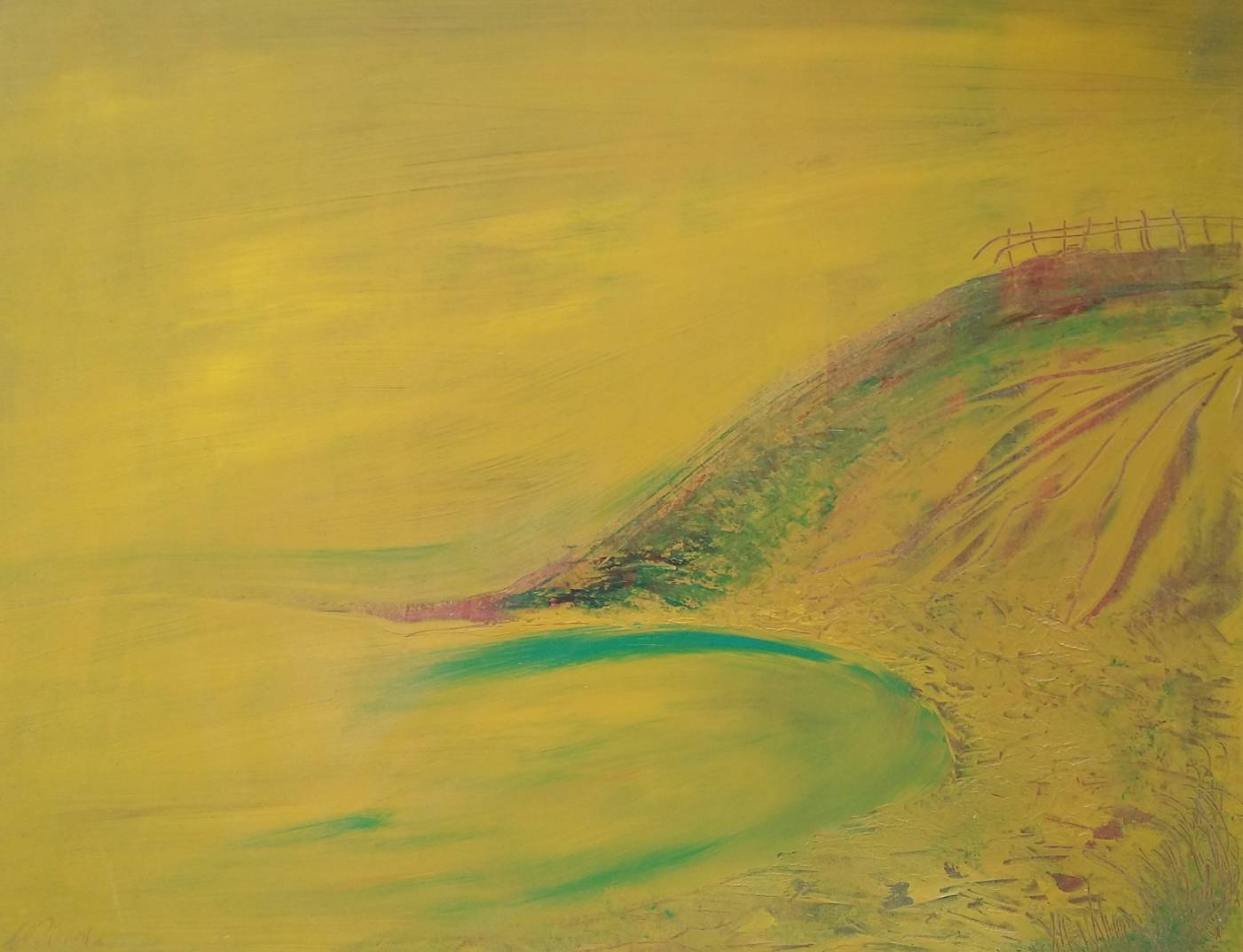 Ten obraz to eksplozja żółci, która niemalże pulsuje życiem. Dominującym kolorem jest intensywna, ciepła żółć, przypominająca letni dzień, gdzie błękit nieba zdaje się ulatniać w tle. Kompozycja jest dynamiczna, z wyrazistym zakrętem zieleni i fioletu po prawej stronie, który przypomina wzgórze czy może wydmę. Artysta używa technik mieszania i rozcierania farb, co dodaje tekstury i głębi. Wyczuwalna jest atmosfera spokoju, ale też jakaś ukryta tajemnica. To taki obraz, który możesz interpretować na różne sposoby, zależnie od humoru. Człowiek ma wrażenie, że może zaraz znajdzie się za tym wzgórzem coś magicznego. Hmm, ciekawe co tam jest! Dzieciaki na pewno powiedziałyby, że to miejsce, gdzie ukrywają się smoki. Styl jest prawie abstrakcyjny, ale zachowuje naturalne formy. Artysta bawi się światłem i kolorem, przypomina trochę impresjonizm, ale z nutą własnego, unikalnego stylu. To fascynujące, jak kilka pociągnięć pędzla może wywołać tak różne emocje i refleksje. Sama patrząc na to dzieło, czuję, jakby wyciągało mnie poza codzienność, w przestrzeń pełną marzeń i niezwykłości. Może to jest właśnie artystyczny geniusz, ten element "wonder", który sprawia, że obraz nie jest tylko kawałkiem materiału pokrytym farbą, ale żywą opowieścią.