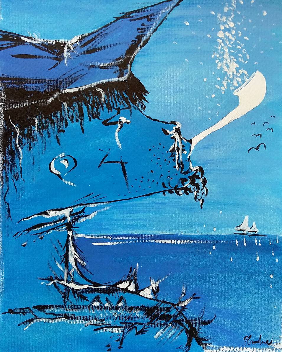 Obraz, który widzę, jest jak marzenie o błękitnym niebie i falującym morzu. Dominują odcienie niebieskiego, od jasnego błękitu po głębokie granaty. Na pierwszym planie widzimy zderzenie morskiego życia z elementami zdać się nie z tego świata. Kompozycja jest dynamiczna, z asymetrycznymi kształtami, które zdają się tańczyć na powierzchni płótna. Artysta użył szerokich pociągnięć pędzla, tworząc efekt ruchu i spontaniczności. Atmosfera jest lekka, wręcz bajkowa, a jednak kryje w sobie pewną tajemniczość. Myślę, że ten obraz jest pełen mistyki, a może nawet kapryśny. Styl jest nowoczesny, z nutą surrealizmu. Artysta eksperymentował z teksturą, dodając głębi kolorom i liniom. Każdy element prowadzi oko widza w niespodziewanym kierunku. Patrząc na to dzieło, można poczuć spokój, jakby czas się zatrzymał. Ale jednocześnie, there's a sense of wonder, tak jakby coś magicznego miało się wydarzyć. Mój młodszy brat powiedziałby: "To jest jak sen, tylko na jawie!". Osobiście czuję, że obraz wywołuje u mnie nostalgiczne wspomnienia z dzieciństwa nad morzem. Jest w nim coś, co sprawia, że chcę się uśmiechnąć i rozpłynąć w tej bezkresnej przestrzeni. Każdy, kto na niego spojrzy, znajdzie w nim inne opowieści. To niesamowite, jak sztuka potrafi zagrać na emocjach, prawda?