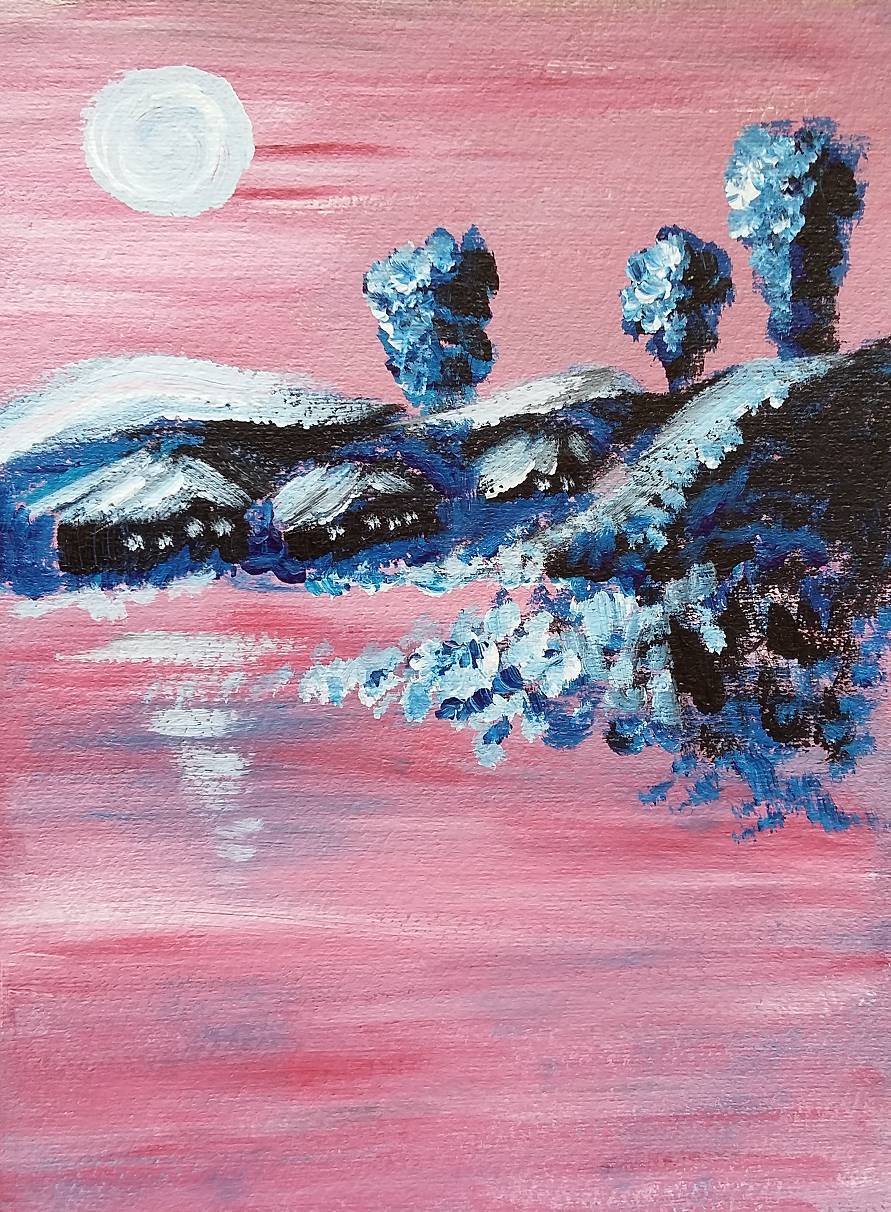 Na obrazie dominują odcienie różu i niebieskiego. Różowe niebo, niczym z bajki, wisi nad spokojnym krajobrazem. Niebieskie drzewa, jakby puszyste chmurki, wyrastają z falistych wzgórz. Wszystko spowite w delikatnym świetle bieli, która nadaje scenie magiczny look. Kompozycja jest harmonijna, pełna spokoju i melancholii. Atmosfera obrazu jest nim niemal uspokajająca. Czujesz się jakbyś był w innym świecie, gdzie czas płynie wolniej. Niebiesko-białe drzewa są jak baśniowe postacie pilnujące tej zaczarowanej krainy. Ten obraz emanuje nostalgiczną tęsknotą za czymś nieuchwytnym. Styl artysty to połączenie impresjonizmu z surrealizmem. Technika, jaką używał, wydaje się być swobodna, z wyraźnymi, dynamicznymi pociągnięciami pędzla. Może ci przypomnieć dziecięce marzenia o miejscach, które istnieją tylko w wyobraźni. Obraz może budzić różne emocje. Można poczuć spokój i jednocześnie nutkę smutku, jakby coś pięknego zaraz miało się skończyć. Może skojarzyć się z chwilą ciszy nad brzegiem tajemniczego jeziora. „Drzewa wyglądają jak brokuły!”, powiedziałby 7-letni maluch. Dzieło to zachęca do refleksji, łączy w sobie piękno z odrobiną surrealizmu. Dreamy atmosfera sprawia, że chce się na chwilę zanurzyć w tej scenerii. Każdy może znaleźć w nim coś dla siebie, coś, co dotknie duszy i zostanie na dłużej w pamięci. Każdy pociągnięcie pędzla opowiada swoją własną historię. Fascynujące.