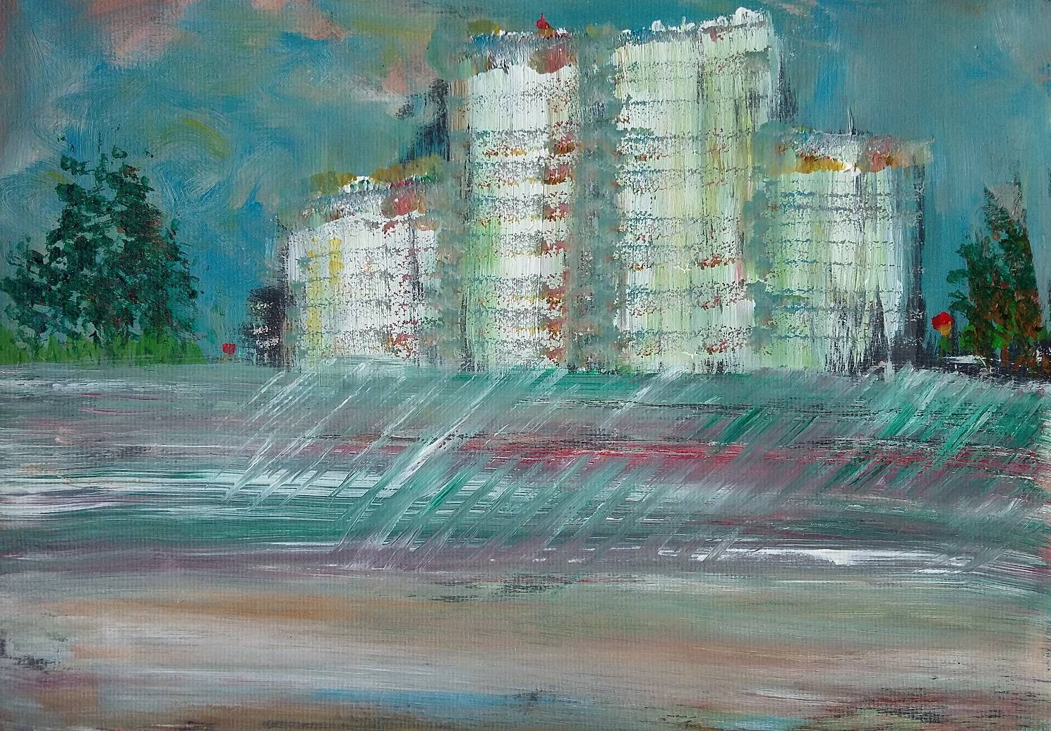 Na obrazie dominują chłodne kolory, takie jak zielenie i błękity, przełamane delikatnymi akcentami bieli i fioletu. Kształty budynków są rozmyte, co dodaje nuty tajemniczości. Kompozycja obrazu jest dynamiczna, z pionowymi liniami budynków kontrastującymi z poziomymi pociągnięciami pędzla w tle. Widzimy szybkie, ekspresyjne ruchy farby, które nadają całości wrażenie ruchu. Choć krajobraz jest miejski, to emanuje pewnym spokojem i refleksją. Czy to miasta ducha? Może tak być! Artysta użył techniki impasto, gdzie grube warstwy farby dają powierzchni fakturę i głębię. Ten styl dodaje dramatyzmu i intensyfikuje odczucia wizualne. Atmosfera obrazu jest melancholijna, ale jednocześnie pełna życia. Można poczuć nostalgię i tęsknotę za przeszłością. Obraz może wywoływać różne emocje. Dla mnie osobiście to jak podróż w czasie. Zastanawiam się, co by było, gdybym tam był. It's like a dream, gdzie wszystko jest możliwe. Dziecko powie, że budynki są jak wielkie zamki! Cudownie, prawda? Przyglądając się dłużej, można dostrzec jak harmonijnie chaos budynków współgra z ciszą pozostałych elementów. Fascynujące, jak sztuka potrafi uchwycić coś tak ulotnego jak nastrój chwili.