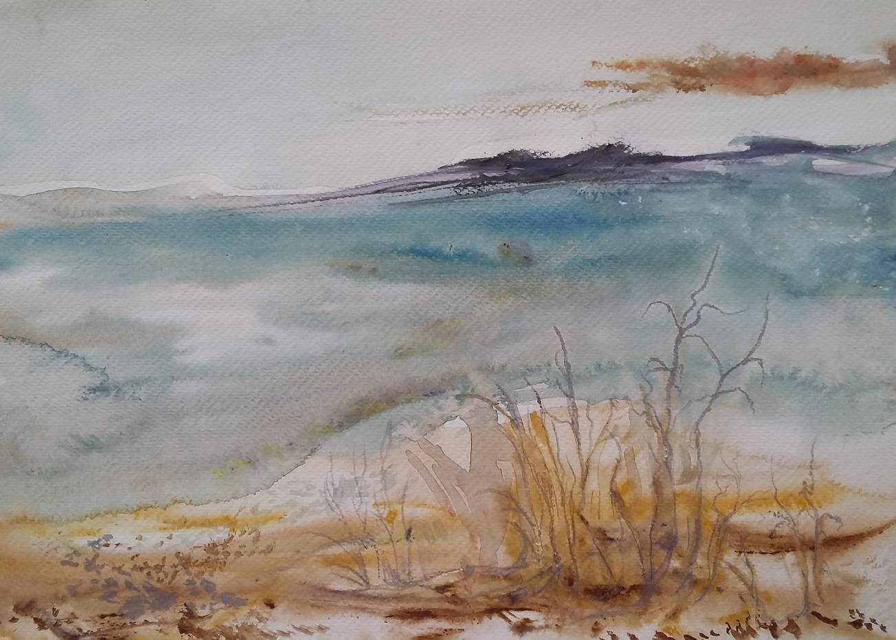 Obraz przedstawia delikatny pejzaż, malowany w tonach pastelowych. Dominuje tutaj błękit połączony z różnymi odcieniami brązów i beżów. Wszystko razem tworzy subtelne, niemalże mgielne tło, gdzie forma jest bardziej zasugerowana niż wyraźnie zarysowana. W centrum kompozycji wyrastają smukłe, wijące się gałęzie, które przypominają nieco tajemnicze krzewy lub suche trawy. Nastrój obrazu jest spokojny, wręcz senny, jakby całość próbowała nas otulić w chłodny wieczór. Artwork ma w sobie coś z impresjonizmu, choć nie w dosadny sposób. Można powiedzieć, że jest to bardziej watercolors w swoim wyrazie. Podczas patrzenia na ten obraz, można wpaść w zadumę, trochę się rozmarzyć, a nawet poczuć melancholię. Kolory, choć stonowane, wprowadzają ciepłą atmosferę kontrastującą z chłodnym błękitem. Może to właśnie echo wspomnienia z dalekiej podróży albo marzenie o spokojnym dniu na łonie natury. Mały chłopiec mógłby powiedzieć: "To tak jakby las się schował w chmurach". Osobiście, patrząc na to dzieło, czuję pewien rodzaj spokoju, jakby świat na chwilę się zatrzymał, dając przestrzeń na oddech. Jest to moment, który mówi "pause", zatrzymaj się i pomyśl. O tak, ciepło i spokój.