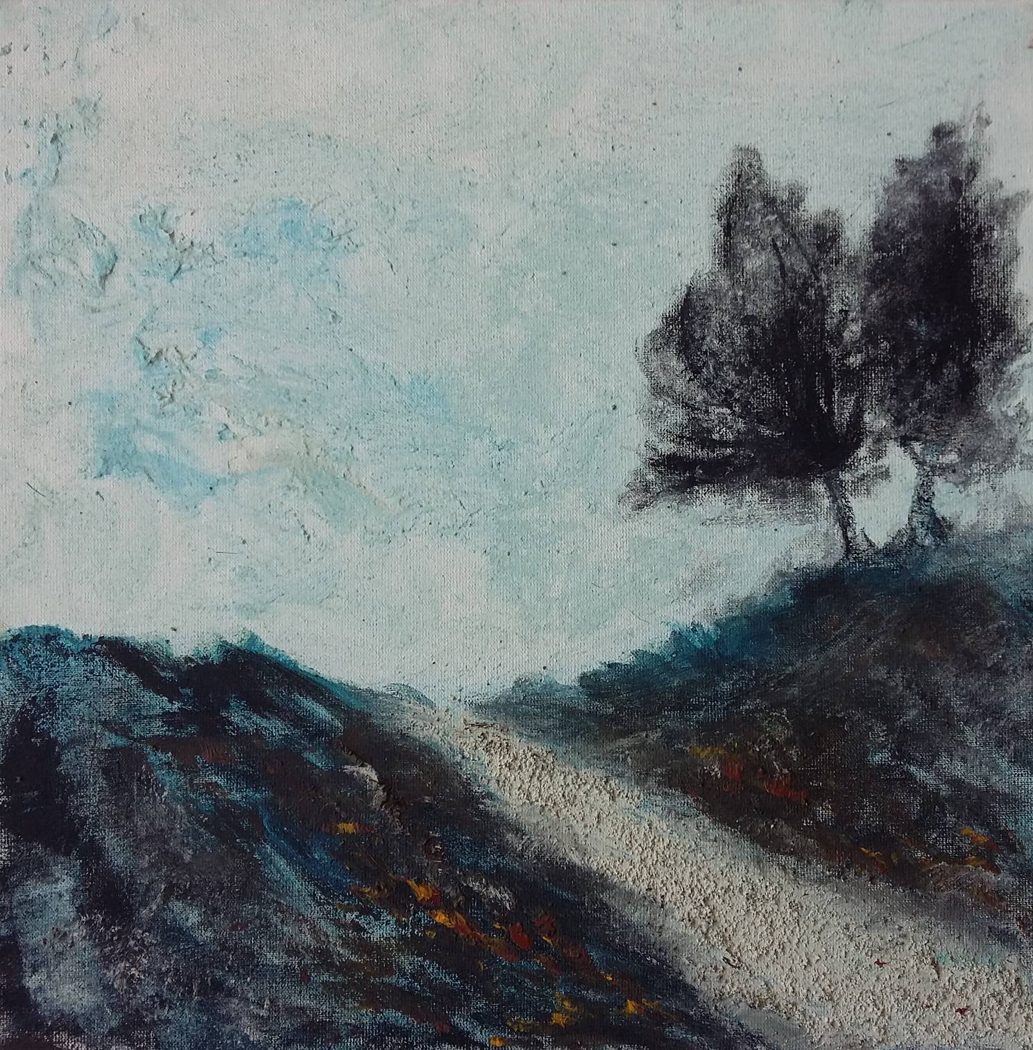 Obraz przedstawia melancholijny krajobraz, w którym dominują subtelne odcienie błękitu i szarości. Ścieżka, wijąca się wśród wzgórz, prowadzi spojrzenie ku dwóm drzewom po prawej stronie. Ich ciemne sylwetki wyraźnie odznaczają się na tle nieba. Kompozycja jest dynamiczna, z asymetrycznym układem i teksturą farby, która dodaje głębi. Czuć lekki niepokój, ale i pewną spokojną kontemplację. Tak jakby drzewa były strażnikami tej cichej krainy. Artysta użył techniki impasto, co nadaje obrazowi trójwymiarowości. Maziaje i nakładająca się faktura farby tworzą wrażenie ruchu. To jakby natura sama chciała się wyrwać z ram płótna. Atmosfera dzieła jest nieco tajemnicza, prawie szeptająca. Patrząc na ten obraz, można poczuć pewną nostalgię za miejscem, którego może nigdy nie widzieliśmy, a jednak wydaje się znajome. Brzmi to trochę jak stek bzdur, ale kto nie lubi pomarzyć? Nastrój balansuje między onirycznym peace a surową rzeczywistością. Drzewa wyglądają, jakby były przyjaciółmi - powiedziałoby dziecko. Takie dzieła pobudzają wyobraźnię, skłaniają do refleksji nad tym, co naprawdę ważne. Czyż to nie cudowne, jak obraz potrafi uchwycić czas i miejsce, które stają się naszym własnym wspomnieniem?