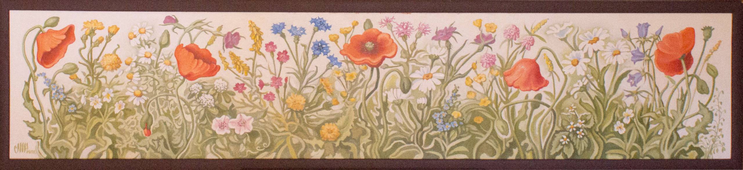 Kompozycja panoramiczna ukazująca 20 gatunków kwiatów polnych. Olej, płótno na płycie, rama drewniana wąska, ciemny brąz.