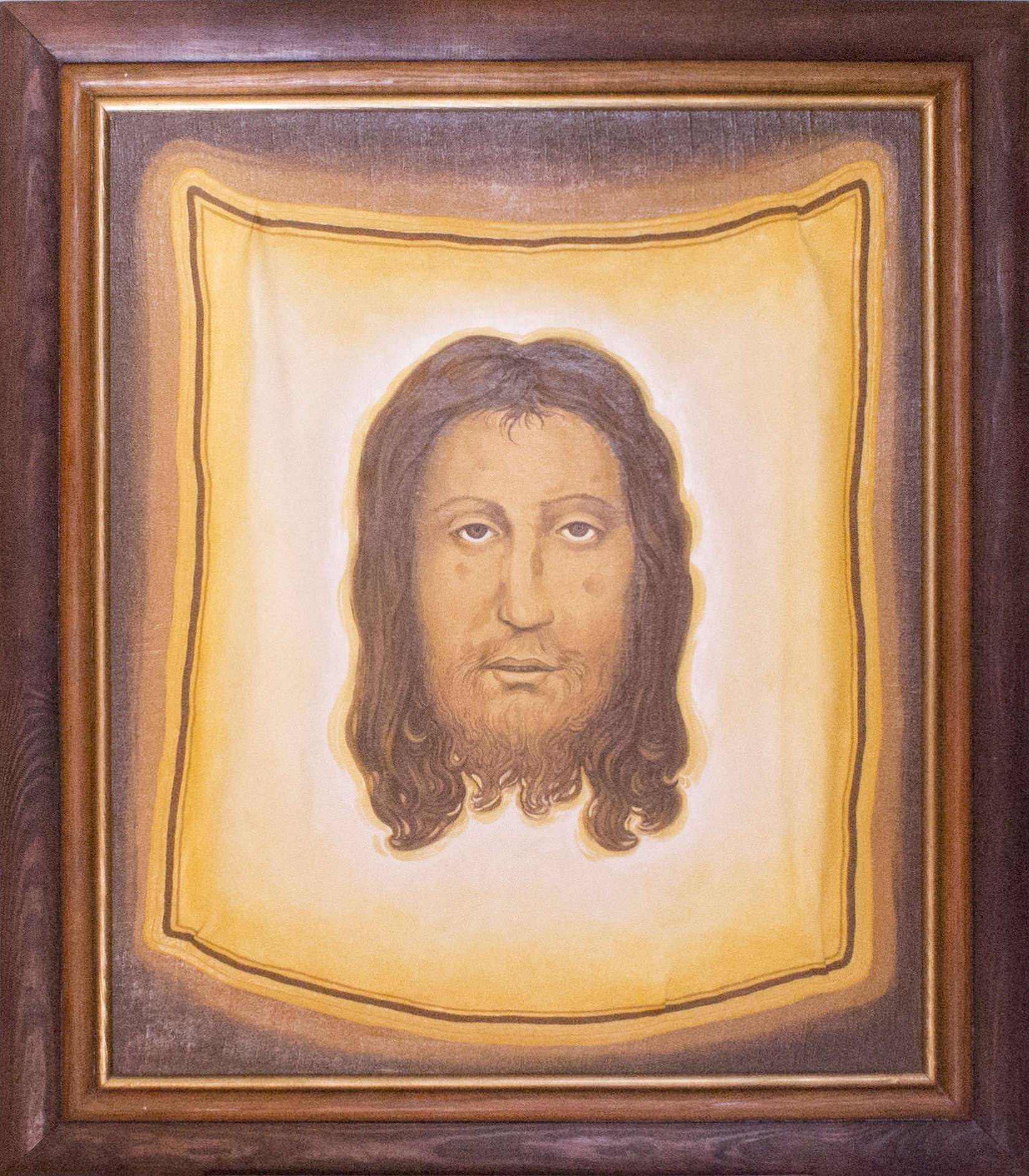 Obraz przedstawiający wizerunek Chrystusa zmartwychwstałego, inspirowany chustą z Manoppello, która uznawana jest za jedyną wiarygodną relikwię chrześcijaństwa. Obraz namalowany na jedwabnym płótnie.