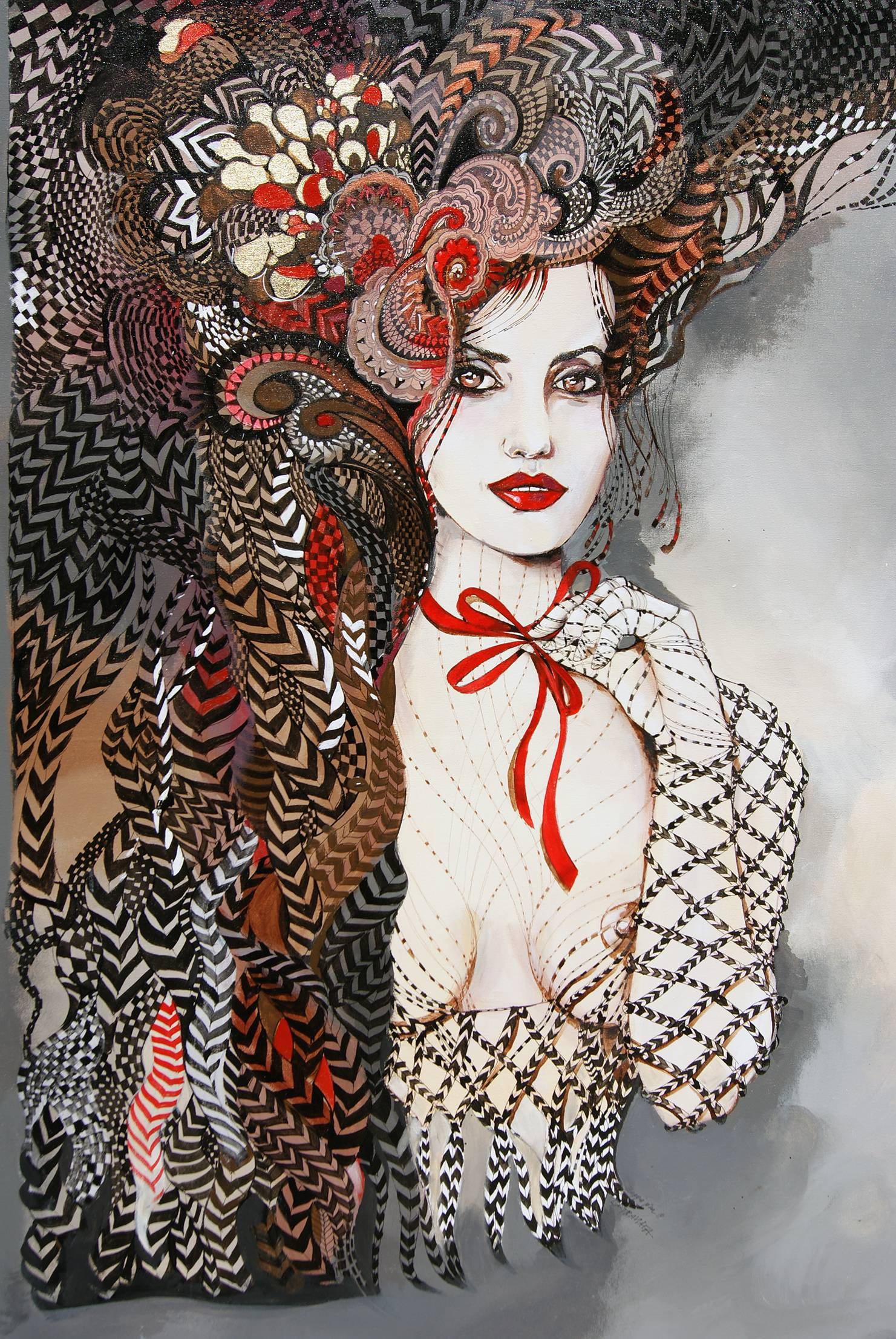 Obraz emanuje bogactwem wzorów i kolorów, przyciągając wzrok jak magnes. Na pierwszym planie widzimy tajemniczą postać kobiecą, której twarz wydaje się wyłaniać z morza abstrakcyjnych form. Jej włosy przypominają misternie utkane faliste linie, pełne brązów, czerni i czerwieni. Kombinacja wzorów przypomina kalejdoskop, gdzie raz po raz można odnaleźć nowe kształty i faktury. Atmosfera tego dzieła jest zarówno oniryczna, jak i nieco niepokojąca, przenosząc widza w świat baśniowych motywów. Artysta zastosował technikę mieszania tradycyjnego portretu z abstrakcją. Użycie wyrazistego kontrastu bieli i czerni, jak i ciepłych akcentów czerwieni, nadaje całości dramatyzmu. Styl jest jednocześnie klasyczny i nowoczesny, co sprawia, że obraz przyciąga różnorodnych odbiorców. Emocje, jakie budzi, oscylują między fascynacją a zagadką. A teraz czas na zdanie, którego mogłoby użyć 7-letnie dziecko: Ona ma bardzo kolorowe włosy! Moja pierwsza reakcja? Wow, co za intricate design. Obraz pozostawia widza z pytaniem, co kryje się za tą nieodgadnioną twarzą. Tęsknota za odkrywaniem sekretnych historii, które mogą być zapisane w tych liniach, to chyba to, co przyciąga mnie najbardziej.