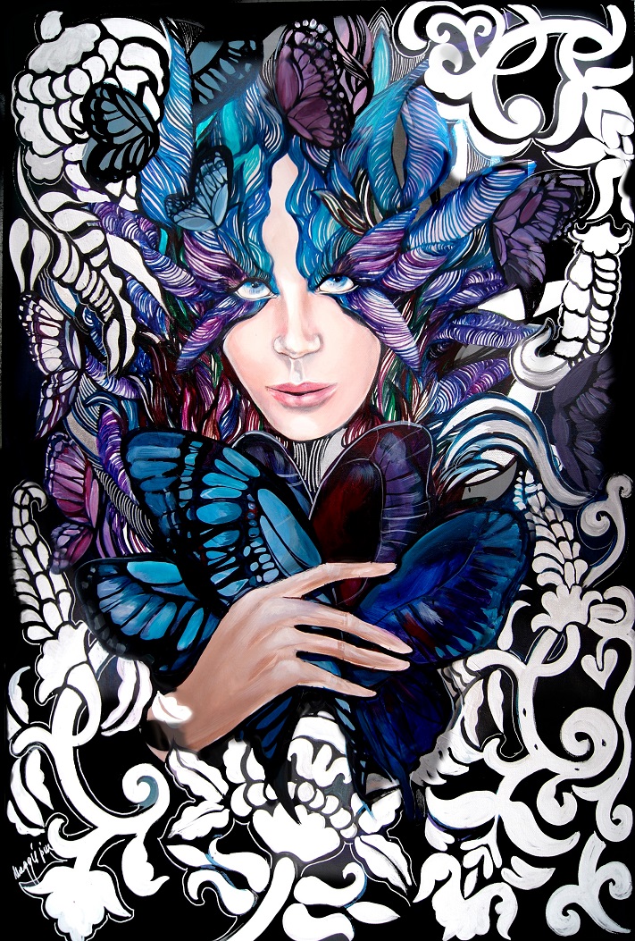 Obraz przyciąga wzrok bogactwem barw i intrygującą kompozycją. Dominują tutaj błękity, fiolety i odcienie czerni, które tworzą tajemniczą i magiczną atmosferę. Centralną postacią jest kobieta otoczona motylami i liśćmi, które zdają się być częścią jej samej. Jej oczy są hipnotyzujące, jakby skrywały tysiąc sekretów. Wow, naprawdę jest piękna! Artystyczne techniki to mieszanka realistycznego przedstawienia twarzy z bardziej abstrakcyjnym tłem, które faluje i pulsuje życiem. Nastroje? Hmm. Jest coś onirycznego w tej kompozycji. Jak sen na jawie. Widz może poczuć się uwodzony i zaintrygowany tą baśniową sceną. Może to lekka melancholia, ale i nadzieja na coś nowego. Patrząc na ten obraz, czuję spokój i jednocześnie fascynację. Jest tu też whisper of mystery, która wciąga i nie pozwala oderwać wzroku. Te elementy splecione razem dodają głębii i zachęcają do osobistych refleksji i interpretacji.