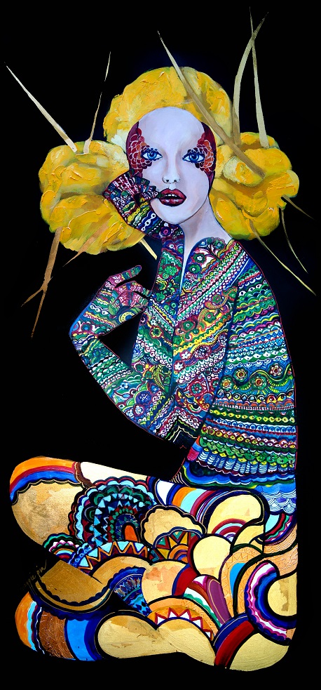 Obraz przyciąga wzrok feerią barw i zaskakującą kompozycją. Postać na czarnym tle zdaje się wychodzić z płótna, intrygując swoją intensywnością. Kolory żyją własnym życiem: od jaskrawego żółtego po głębokie odcienie niebieskiego i zieleni. Ubranie osoby to festiwal wzorów i detali, przypominające kalejdoskop. Nastrój? Niezwykle enigmatyczny. Jak sen, gdzie rzeczywistość miesza się z fantastyką. Styl artysty kipi eklektyzmem. Techniki? Zaskakująca mieszanka tradycji i awangardy. Intrygujące linie i przemyślana asymetria tworzą dynamikę, która trzyma widza w napięciu. A ta twarz... Co myśli? Co czuje? Obraz wywołuje falę emocji, od zachwytu po lekkie zaniepokojenie. Przypomina mi trochę "dreamworld", gdzie nie wszystko jest tym, czym się wydaje.