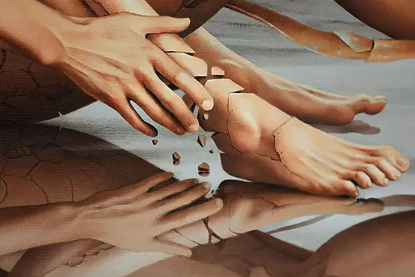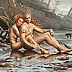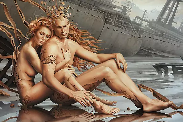 Obraz przedstawia dwie postacie siedzące na tle opuszczonych statków. Ich ciała wydają się pękać, odkrywając mechaniczne wnętrza. Kolory są stonowane, dominują brązy i szarości. Postacie są stylizowane, jakby artysta chciał połączyć ludzkie ciało z maszyną. W tle widać ogromny, przerdzewiały statek, co dodaje scenie melancholijnego nastroju. Artystka używa wyraźnych konturów i precyzyjnych detali, by podkreślić kontrast między delikatnością skóry a surowością metalowych elementów. Atmosfera jest pełna nostalgii, ale też tajemnicy. To trochę jak powrót do przeszłości, gdy technologia i człowieczeństwo się przenikały. Widząc to, można poczuć się zagubionym w rozważaniach o przemijaniu i naturze człowieczeństwa. Ja bym się przestraszył, bo skąd te roboty! Sombrero na głowie i lecimy ku przyszłości. To dzieło promieniujące emocjonalną głębią; widz może się zastanawiać, gdzie kończy się człowiek, a zaczyna maszyna. Fascynating. Każdy element zdaje się opowiadać własną historię, zapraszając do interpretacji.