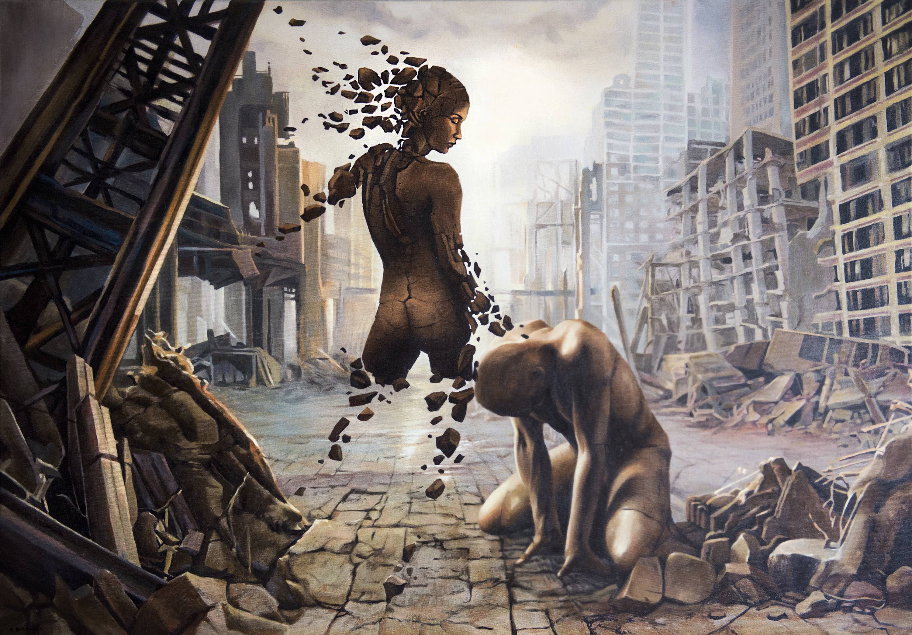 Obraz przedstawia post-apokaliptyczny krajobraz z ruinami miasta. Kolory są stonowane, dominują brązy i szarości, co nadaje dziełu melancholijną atmosferę. Na pierwszym planie widzimy dwie postaci. Jedna z nich, w pozycji klęczącej, wydaje się pogrążona w rozpaczy. Druga, rozpadana na kawałki, jakby unosi się ku górze. Fragmenty jej ciała wyglądają, jakby wiatr je rozwiewał. To naprawdę intrygujące, jak artysta potrafił uchwycić ulotność chwili. Styl obrazu jest nieco surrealistyczny, z wyczuwalną nutą realizmu. Detale w ruinach i ciekawa gra światła oraz cienia dodają głębi. Artysta wykorzystuje technikę, która przypomina nieco iluzję optyczną. Widz zostaje wciągnięty w ten świat, próbując zrozumieć, co się wydarzyło, co tu się dzieje. Obraz wywołuje wiele emocji. Można poczuć smutek, ale i pewną nadzieję na odnowę. To, co mnie osobiście porusza, to symbolika rozpadającej się postaci. Jakby mówiła „nie wszystko jest stracone”. Wow, daje to do myślenia! Patrząc na to, możemy zastanowić się nad kruchością życia i siłą odrodzenia. Ten obraz to magnes dla myśli, prawdziwy mind-blow.