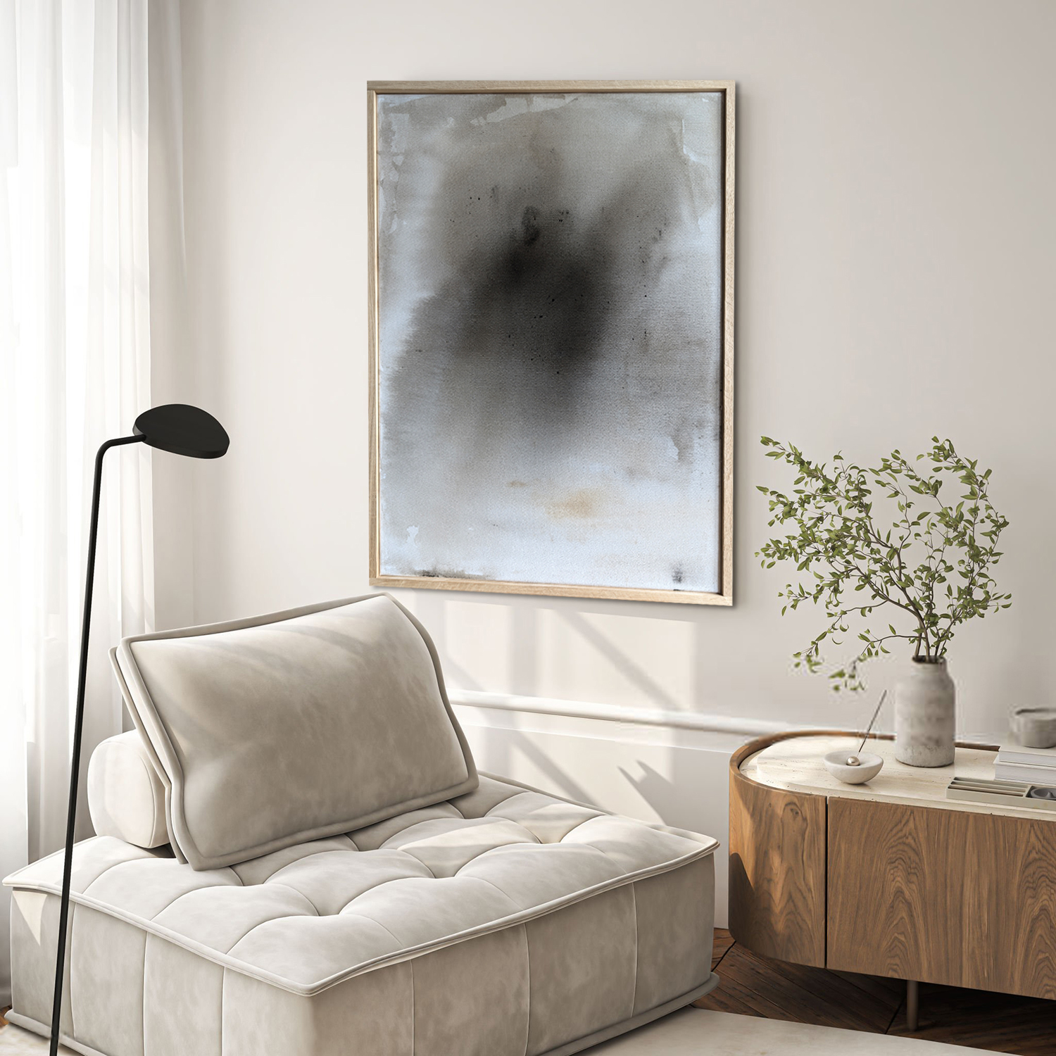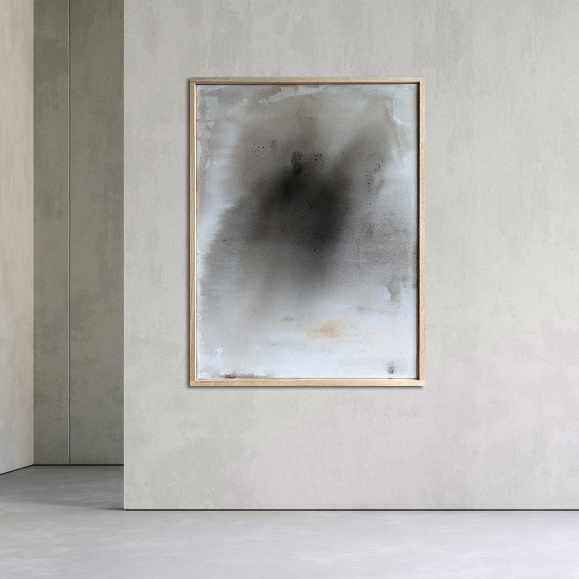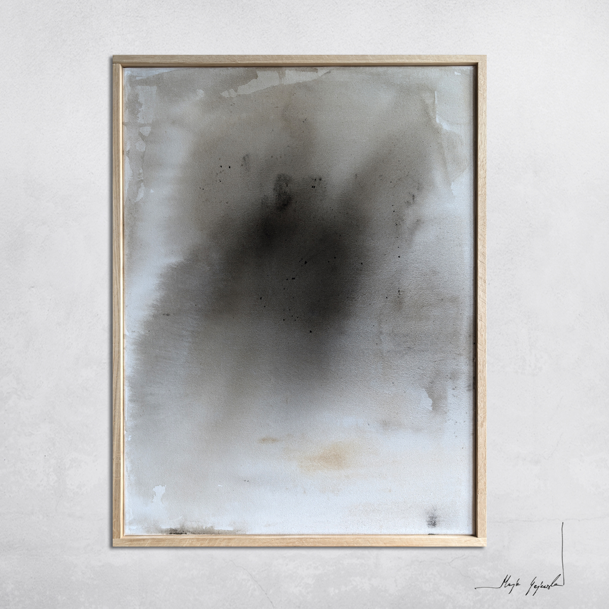 Obraz akrylowy w formacie 80x60cm. Oprawiony w ramę z naturalnego dębu. Kompozycja abstrakcyjna utrzymana w ograniczonej gamie szarości, beżu i czerni. W centralnej płaszczyźnie obrazu rozpościera się nieregularna, organiczna forma o płynnych konturach i zróżnicowanym nasyceniu barwy. W górnej prawej części kompozycji pojawia się ciemniejsza plama – akcent o większej intensywności, wprowadzający napięcie i punkt skupienia wzroku. Delikatne przejścia tonalne, transparentność, brak wyraźnych konturów czy figur oraz świadome wykorzystanie efektu zbliżonego do techniki akwarelowej sprawia, że kompozycja ma charakter nastrojowy i medytacyjny. Praca wyróżnia się oszczędnością środków wyrazu i dążeniem do minimalizmu. Zastosowanie jednego dominującego tonu i ograniczonej palety barw nadaje obrazowi harmonię i spokój. Naturalna, drewniana rama dopełnia minimalistyczny charakter dzieła, podkreślając jego organiczny i surowy wymiar.