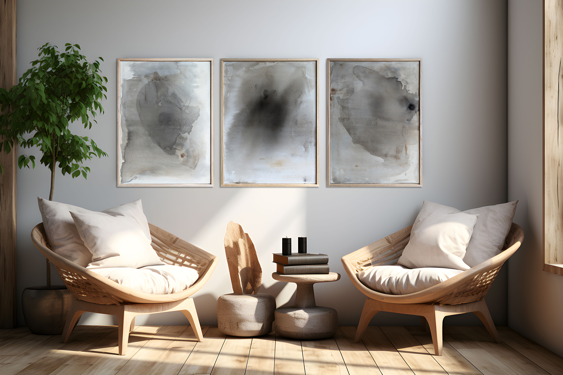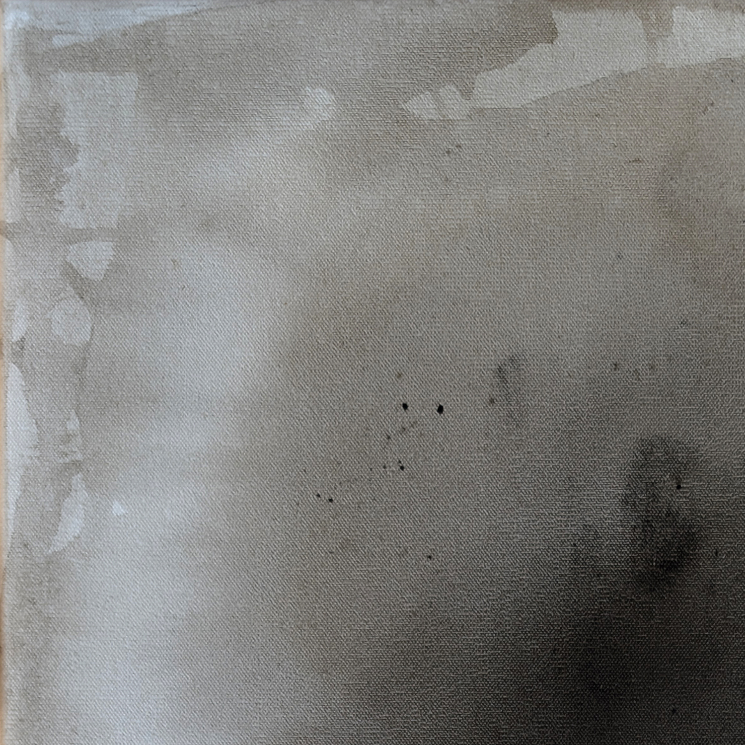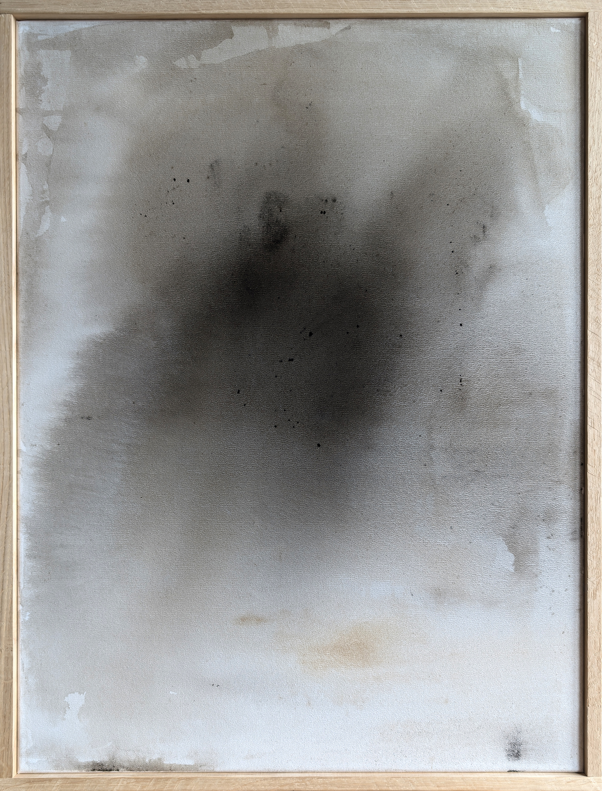 Obraz akrylowy w formacie 80x60cm. Oprawiony w ramę z naturalnego dębu. Kompozycja abstrakcyjna utrzymana w ograniczonej gamie szarości, beżu i czerni. W centralnej płaszczyźnie obrazu rozpościera się nieregularna, organiczna forma o płynnych konturach i zróżnicowanym nasyceniu barwy. W górnej prawej części kompozycji pojawia się ciemniejsza plama – akcent o większej intensywności, wprowadzający napięcie i punkt skupienia wzroku. Delikatne przejścia tonalne, transparentność, brak wyraźnych konturów czy figur oraz świadome wykorzystanie efektu zbliżonego do techniki akwarelowej sprawia, że kompozycja ma charakter nastrojowy i medytacyjny. Praca wyróżnia się oszczędnością środków wyrazu i dążeniem do minimalizmu. Zastosowanie jednego dominującego tonu i ograniczonej palety barw nadaje obrazowi harmonię i spokój. Naturalna, drewniana rama dopełnia minimalistyczny charakter dzieła, podkreślając jego organiczny i surowy wymiar.
