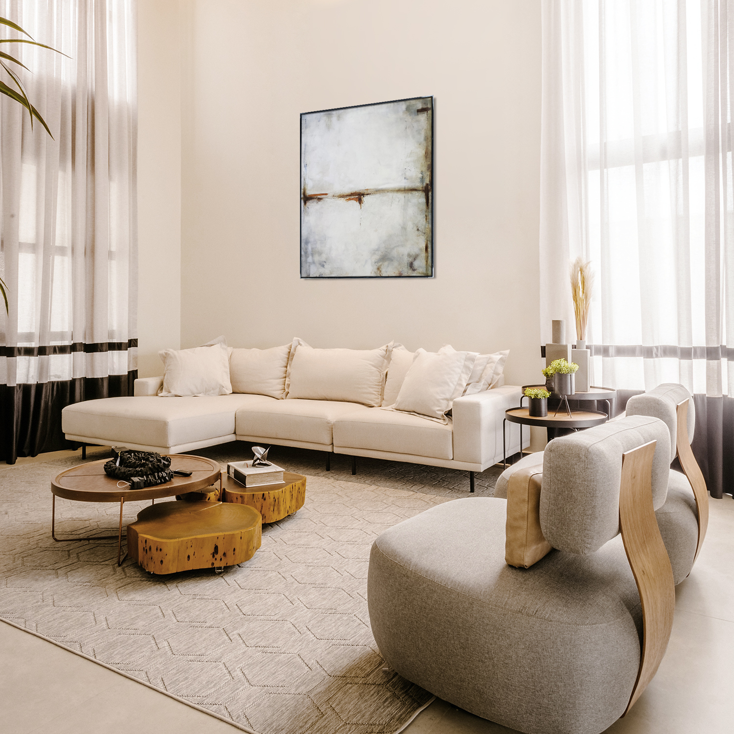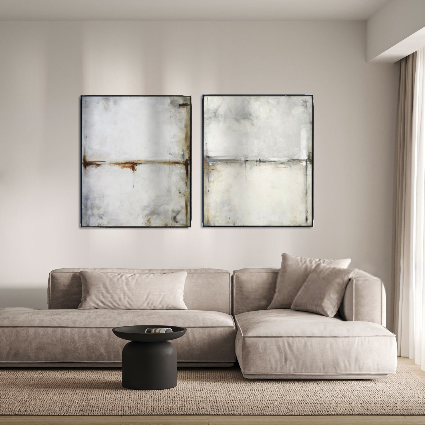 Obraz olejny w formacie 120x100cm. Harmonijny, minimalistyczny obraz w bieli i beżu z akcentami szarego i brązu. Subtelna kolorystyka i zredukowana kompozycja obrazu pozwoli idealnie wpasować się we współczesne wnętrza z dodatkami bieli, czy szarości. Każdy obraz na płótnie to poszukiwanie powiązań pomiędzy kolorami. Obrazy są nie tylko dekoracją salonu czy sypialni, są przede wszystkim odzwierciedleniem naszego stylu i atmosfery danego wnętrza.