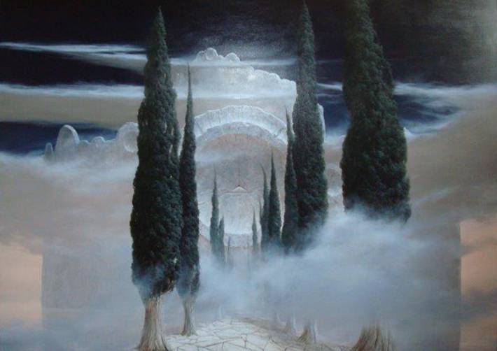 Obraz ten to prawdziwa podróż do krainy marzeń. W centrum kompozycji widzimy majestatyczne cyprysy, które strzelają w niebo jak zielone wieże. Ich ciemna zieleń kontrastuje z jasnymi obłokami mgły, która snuje się tuż nad ziemią. Tło stanowi niezwykłe, tajemnicze niebo, otulające całość bladym, srebrzystym światłem. To trochę jak być w magicznej krainie, gdzie wszystko wydaje się zawieszone w czasie. Atmosfera bijąca z obrazu jest spokojna, ale jednocześnie intrygująca. Mistycyzm tego miejsca sprawia, że czujemy się jak odkrywcy zapomnianej krainy. Technika artystyczna tutaj użyta to chyba oil painting – farby olejne pięknie oddają głębię kolorów i subtelne przejścia między odcieniami. Każdy detal, od drzew po niebo, jest przemyślany i szczegółowy, co potęguje wrażenie tajemniczości. Obraz może wywoływać w widzu różnorodne emocje. Może to być zachwyt nad pięknem natury, ale także nutka niepokoju, co czai się za tymi ogromnymi, monumentalnymi drzewami. Ja osobiście czuję dreszczyk emocji i chęć odkrycia, co znajduje się dalej, głębiej w tej krainie. Dziecko mogłoby powiedzieć: "Wow, to wygląda jak las wróżek!". Ta mieszanka realności i snu sprawia, że obraz zdaje się żyć własnym życiem, a każdy z nas odczyta go na swój sposób.