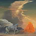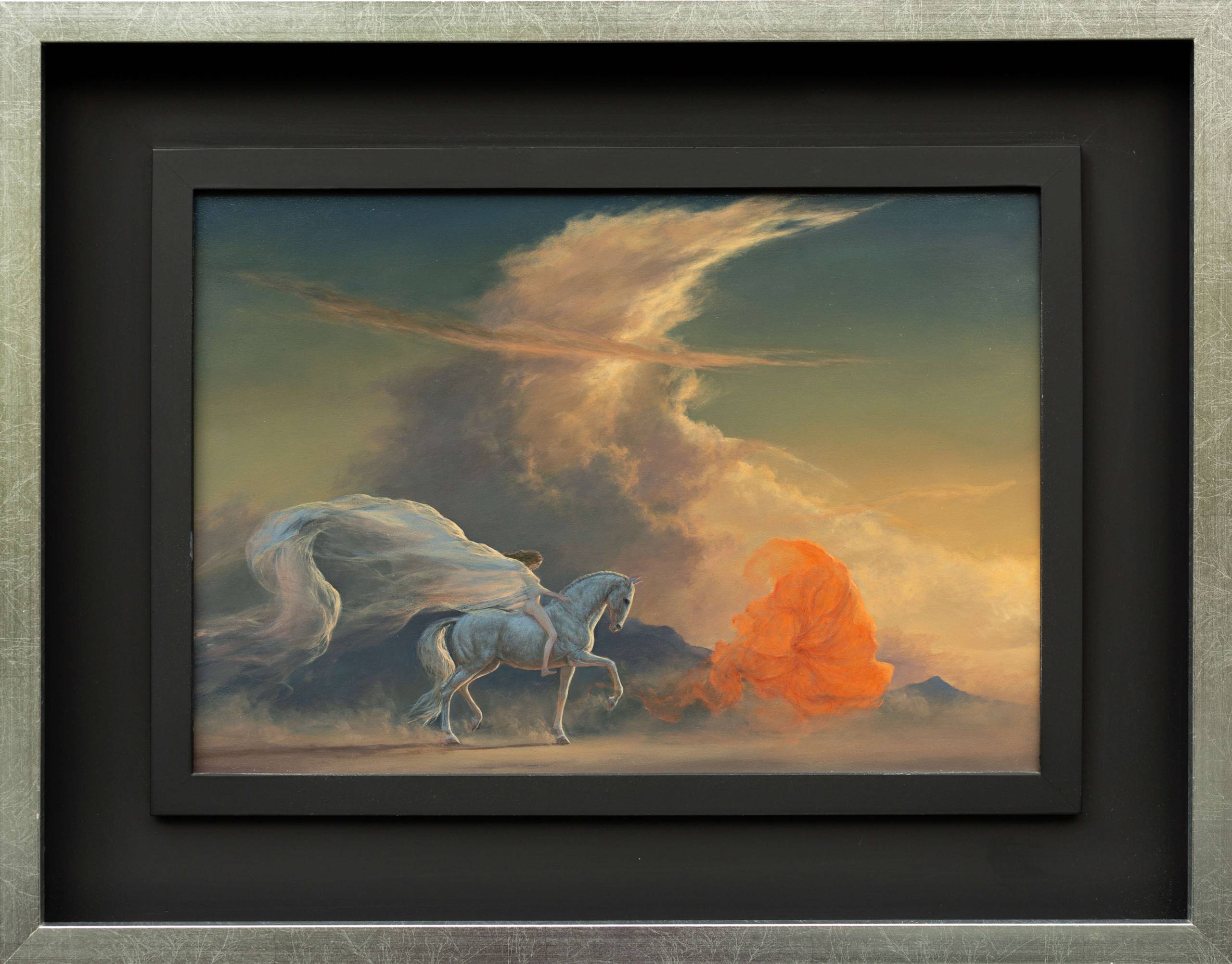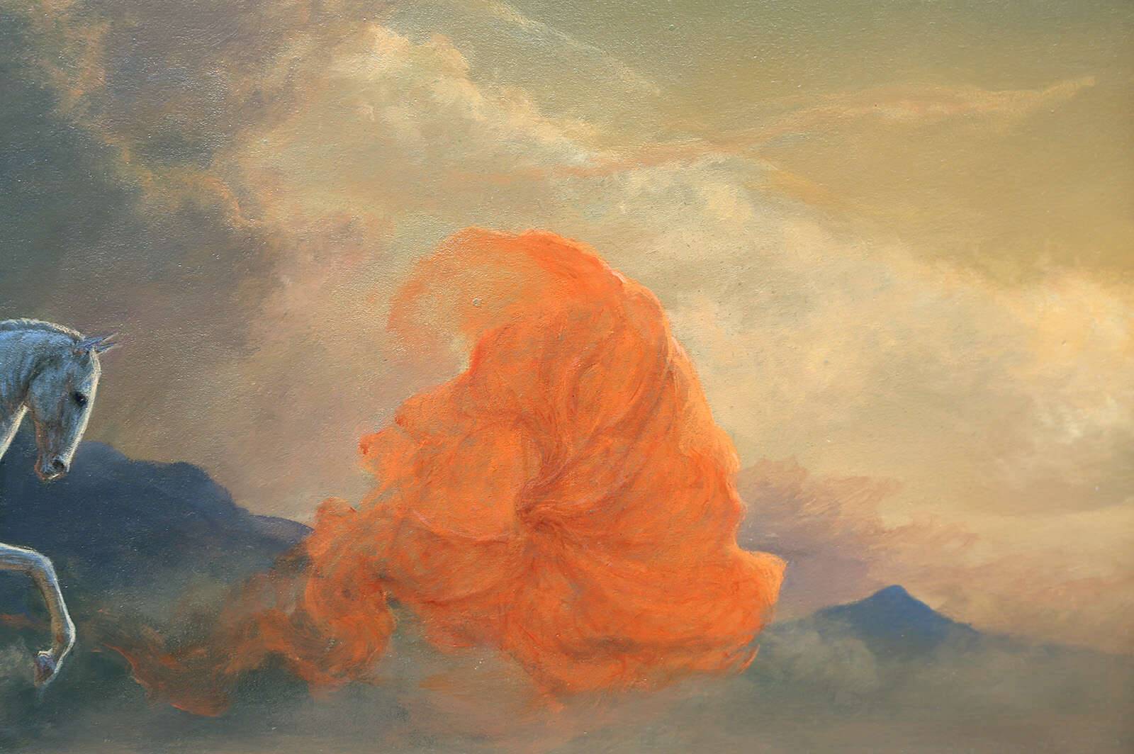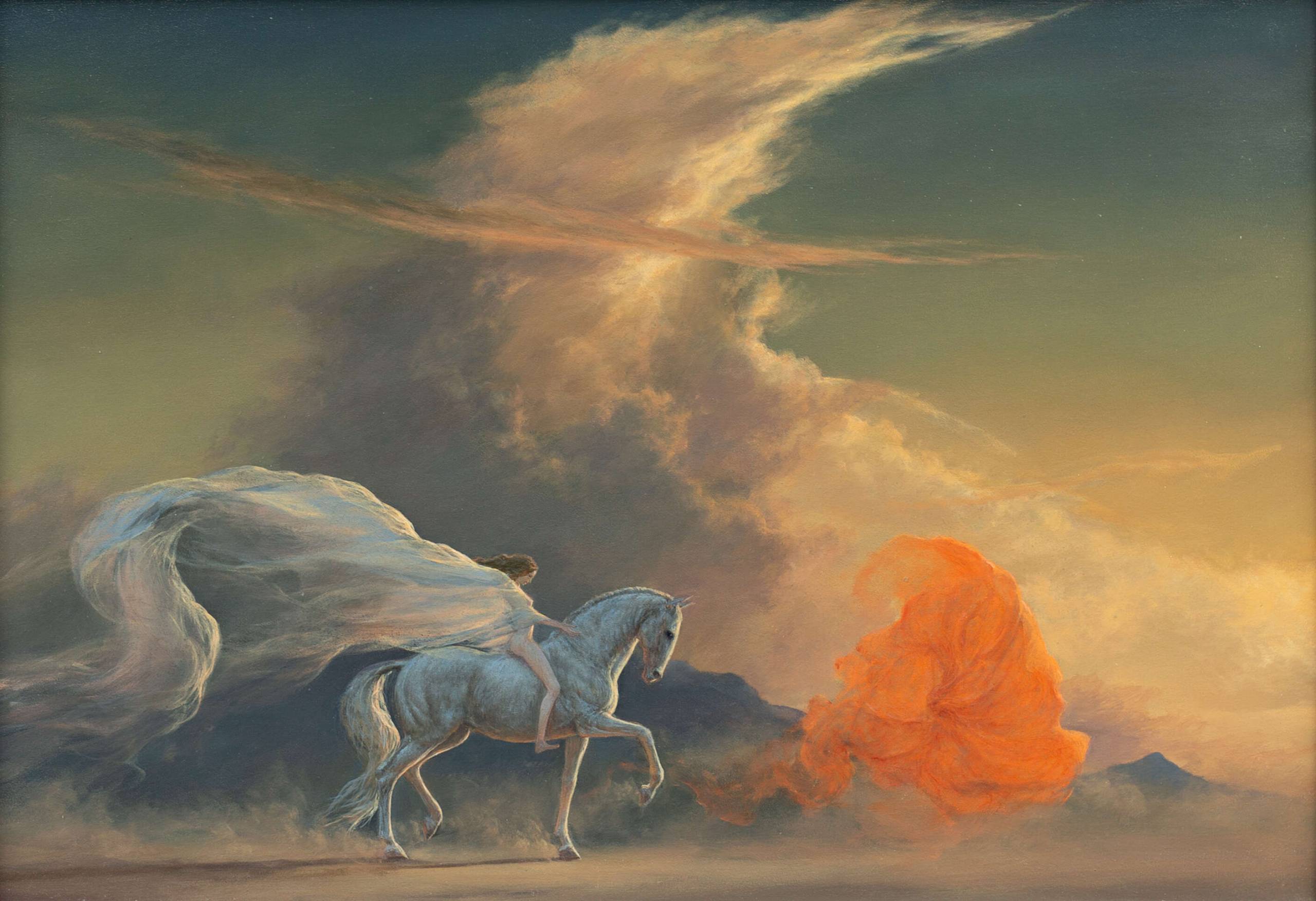 „bez tytułu", rok 2016, olej na płycie, format 30x45 cm (w ramie 47x61 cm) Obraz to prawdziwa poezja w kolorach. Widzimy konia o białej, niemal eterycznej sierści, kroczącego w stronę ognistego obłoku. Niebo malowane pastelowym niebieskim i pomarańczowym, przypomina wschód słońca, który właśnie budzi świat. Ten efekt chmurowy wygląda jak z bajki albo sen. Kontrast między chłodnym błękitem a gorącą czerwienią chmury tworzy dynamiczną harmonię. Kompozycja jest przemyślana: koń skierowany jest ku ognistej chmurze, co sprawia, że obraz emanuje ruchem i napięciem. Styl artysty nawiązuje do surrealizmu, gdzie rzeczywistość miesza się z krainą fantazji. Technika malarska wykorzystuje płynne pociągnięcia pędzla, które dodają miękkości i tajemniczości całej scenie. Odbiorca może poczuć spokój i jednocześnie jakąś wewnętrzną ekscytację, jak przed nieznaną przygodą. Wow, it's amazing! Ten obraz jest jak opowieść, która czeka na odkrycie. Dla mnie osobiście, to jest trochę jak spojrzenie w marzenie, które nie jest do końca wyraźne, ale pełne obietnic. Patrząc na niego, możesz poczuć lekki dreszczyk emocji, jakbyś zaraz miał wskoczyć na grzbiet tego konia i pogalopować w nieznane. "Chciałbym mieć takiego konia", powiedziałby mały chłopiec. To niezwykłe, jak sztuka może poruszać serce.