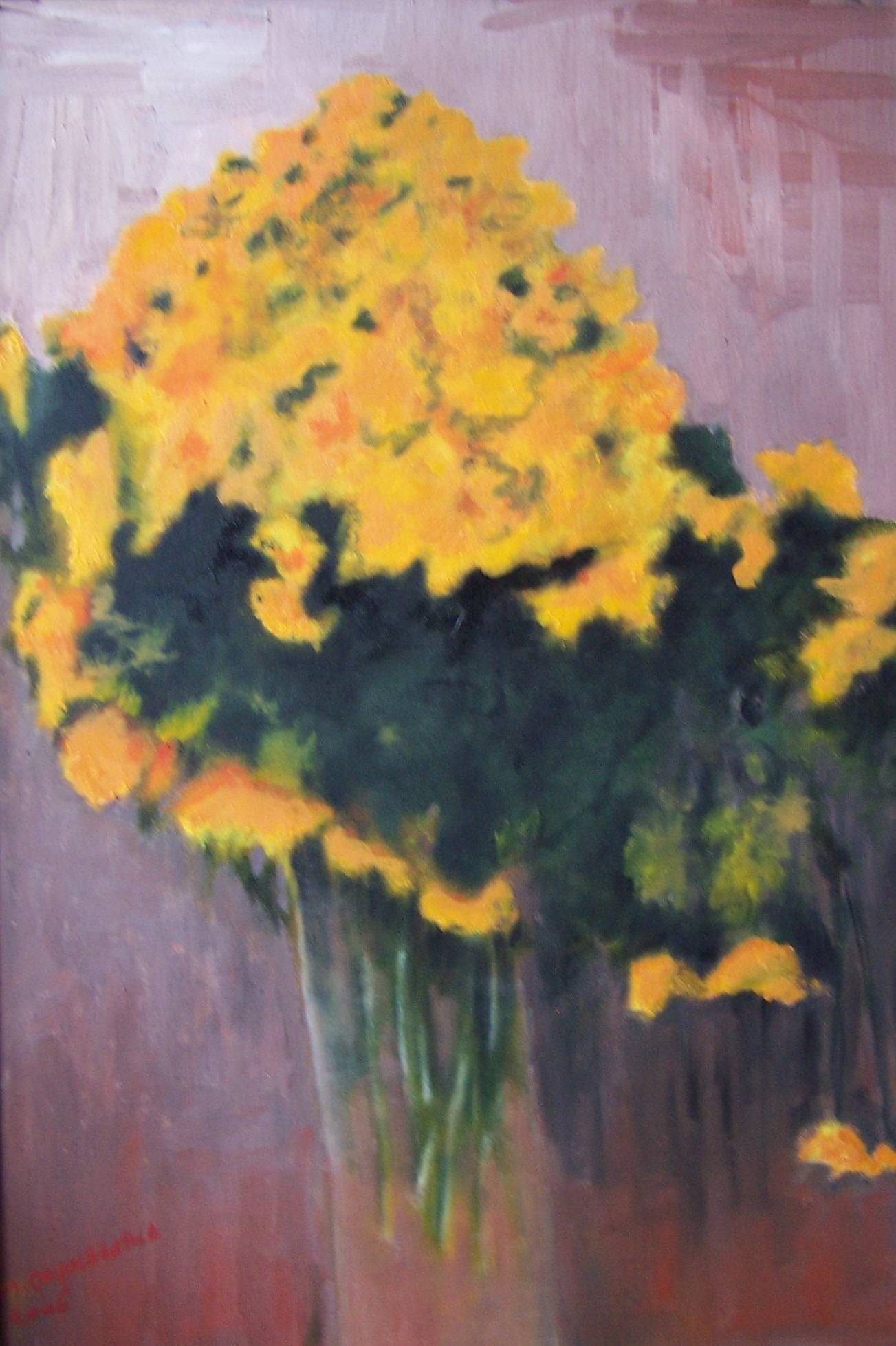Na obrazie rozkwita eksplozja żółtych kwiatów. Dominują one na tle subtelnych odcieni fioletu i szarości, co nadaje dziełu łagodnej głębi. Kształty są delikatnie rozmyte, co sprawia, że całość wydaje się niemal abstrakcyjna. Kompozycja przypomina bukiet w wazonie, gdzie kwiaty zdają się unosić i wibrować w powietrzu. Nastrój obrazu jest pełen nostalgii. Trochę jakbyśmy patrzyli na sen lub wspomnienie spaceru po łące. Techniką, którą wybrał artysta, jest prawdopodobnie impasto. Gruba warstwa farby tworzy teksturę i dodaje trójwymiarowości. Żółty kolor tych kwiatów jest vibrant, a lekko rozmyte kontury tworzą aurę tajemniczości. Dzieło może wywoływać uczucia radości i spokoju, ale też delikatną melancholię. Jeden z widzów mógłby poczuć tęsknotę za latem. "Te kwiatki wyglądają jak puszyste chmurki!" mógłby powiedzieć zachwycone dziecko. Obraz pozwala na chwilę zatracenia i refleksji nad chwilami ulotnymi.
