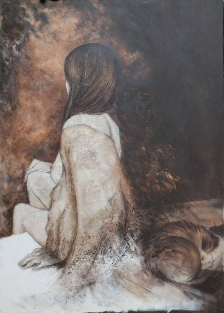 Obraz przedstawia postać o długich brązowych włosach, siedzącą tyłem na tle mglisto rozmazanych brązowo-szarych barw. Ubrana w lekką, jakby eteryczną tkaninę, siedzi z pochyloną głową, co dodaje całej kompozycji melancholijnego i refleksyjnego klimatu. Tło, przypominające wirujące mgły, tworzy iluzję, że postać znajduje się pomiędzy światem rzeczywistym a marzeniem. Ciepłe, przygaszone kolory sprawiają, że obraz wręcz otula tajemniczą atmosferą, a patrząc na niego, można poczuć ciszę. To, co zwraca uwagę, to sposób, w jaki artysta użył pędzla, tworząc tekstury przywodzące na myśl zarys natury czy zimowy pejzaż. Zna ktoś magiczne sztuczki? Ten obraz na pewno ma jakąś ukrytą tajemnicę! Technika swobodnych pociągnięć i subtelnych przejść tonalnych nadaje całości wrażenie miękkości, niczym szept na wietrze. Można się zatopić w tym widoku, poczuć lekki niepokój, może nawet smutek. To dzieło wywołuje emocje, które mieszają się jak kolory na palecie, zachęcając do osobistych refleksji. A może to nostalgia za czymś, co już minęło? I choć nie każdy to przyzna, ten obraz naprawdę działa na wyobraźnię!