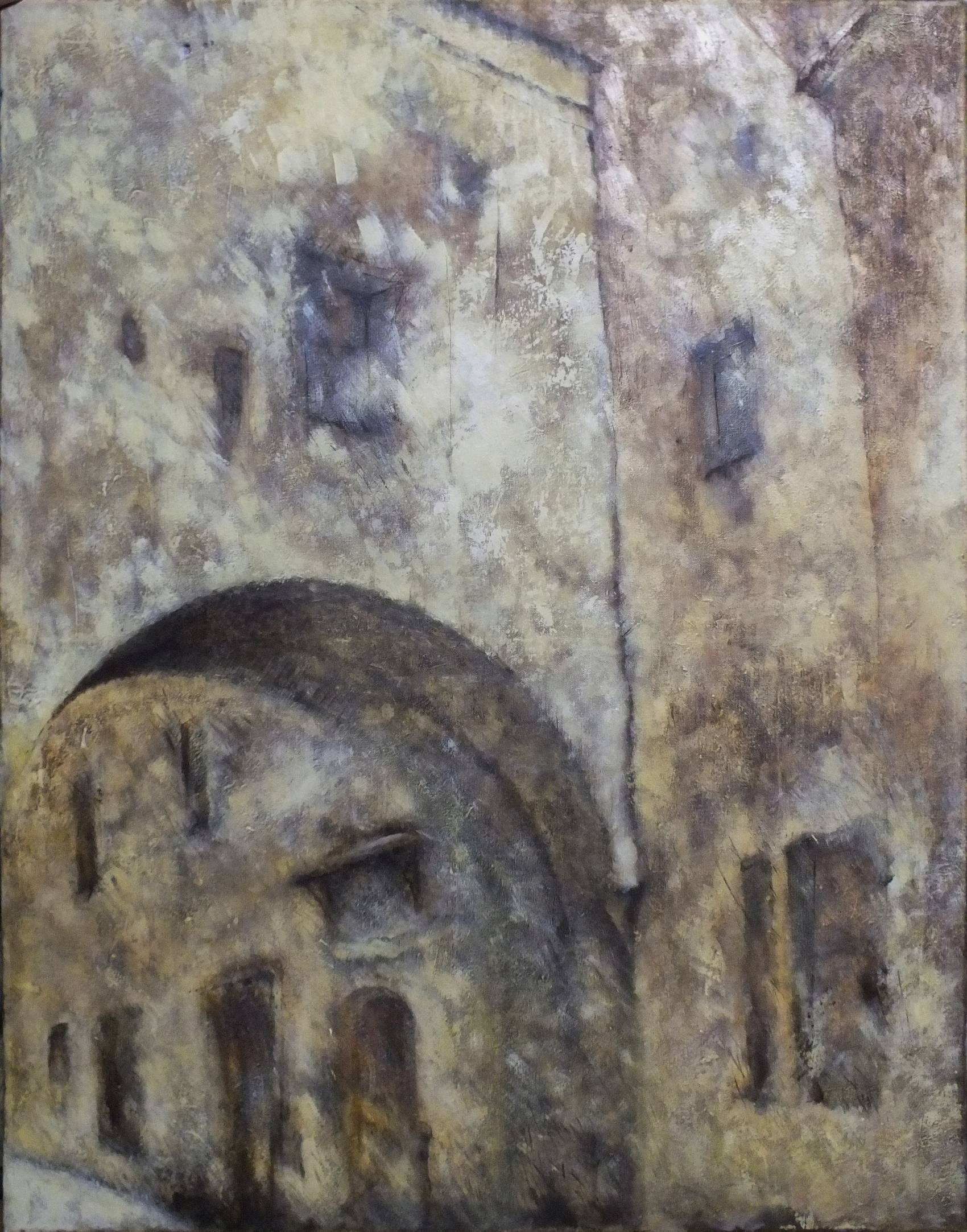 Obraz ukazuje tajemniczą uliczkę, gdzie stara, masywna architektura przyciąga wzrok. W przewadze szaroburych i beżowych odcieniach, mur wydaje się niemal przytłaczać. Delikatne przejścia kolorystyczne tworzą miękkie cienie, dodając głębi i zaskakującej struktury. Szybkie pociągnięcia pędzla i faktura sprawiają wrażenie ruchu, mimo iż całość jest statyczna. Dominujące łuki i prostokąty zdają się zamykać przestrzeń, a stare, wąskie okna, zasnute mgłą, sugerują opowieści o dawnych czasach. Nastrój jest nostalgic, jakby wspomnienie czegoś, co już przeminęło. Można poczuć ducha historii w tej przestrzeni, trochę melancholijnego. Artysta użył techniki impastowej, zgrubnie nakładając farbę, co uwypukla chropowatość ścian. Zestawienie dynamicznych linii i łagodnych tonacji przypomina stylistykę impresjonizmu. Dziś byśmy powiedzieli, że obraz ma swój "charm". Kojarzy mi się ze spacerem po starej części miasta, gdzie czas zatrzymał się w miejscu. Myślę, że każdy, kto patrzy na ten obraz, może poczuć ciepło wspomnień, trochę jak gdyby próbował uchwycić ulotny moment z przeszłości. To trochę tak, jakby patrzeć przez okno do świata pełnego sekretów. A dziecko mogłoby powiedzieć: "Ta budowla wygląda jak z bajki o zamkach i rycerzach".
