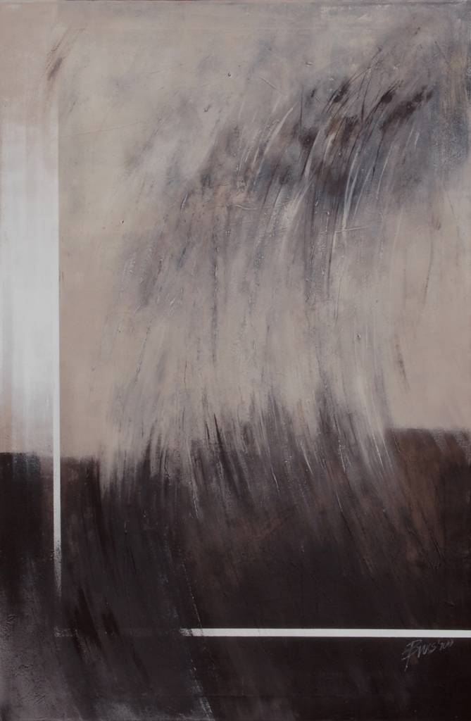 Obraz pełen tajemniczości i subtelnej gry światła i cienia. Dominują na nim stonowane odcienie szarości, brązów i beżu, które tworzą harmonijną, choć nieco melancholijną atmosferę. Kształty są rozmyte, a linie delikatnie wiją się, zwłaszcza na tle gładkiej powierzchni. Kompozycja wydaje się chaotyczna, ale jednocześnie przyciąga wzrok swoją niejednoznacznością. To trochę jak patrzenie przez zroszoną szybę w pochmurny dzień. Nastrój obrazu jest spokojny, ale z nutą niepokoju. Można by rzec, że emanuje z niego pewne "suspense". Styl artysty jest wyrafinowany, z wyczuciem balansując pomiędzy realizmem a abstrakcją. Technika użycia pędzla, widoczna w delikatnych smugach i cienkich warstwach farby, dodaje dziełu nieuchwytnego uroku. Patrząc na obraz, można poczuć ciszę, która czasem jest bardziej wymowna niż słowa. Ale czuję, że coś się tu dzieje. Trochę jakby obraz opowiadał własną historię. Pewnie dzieciak by powiedział: "To wygląda jak kosmos!" Może to refleksja nad przemijaniem albo tylko zabawa światłem i cieniem. Obraz ten prowokuje do zatrzymania się na chwilę i zadumy. Sprawia, że człowiek zastanawia się nad tym, co kryje się pod powierzchnią pozorów. Takie artystyczne "wow".