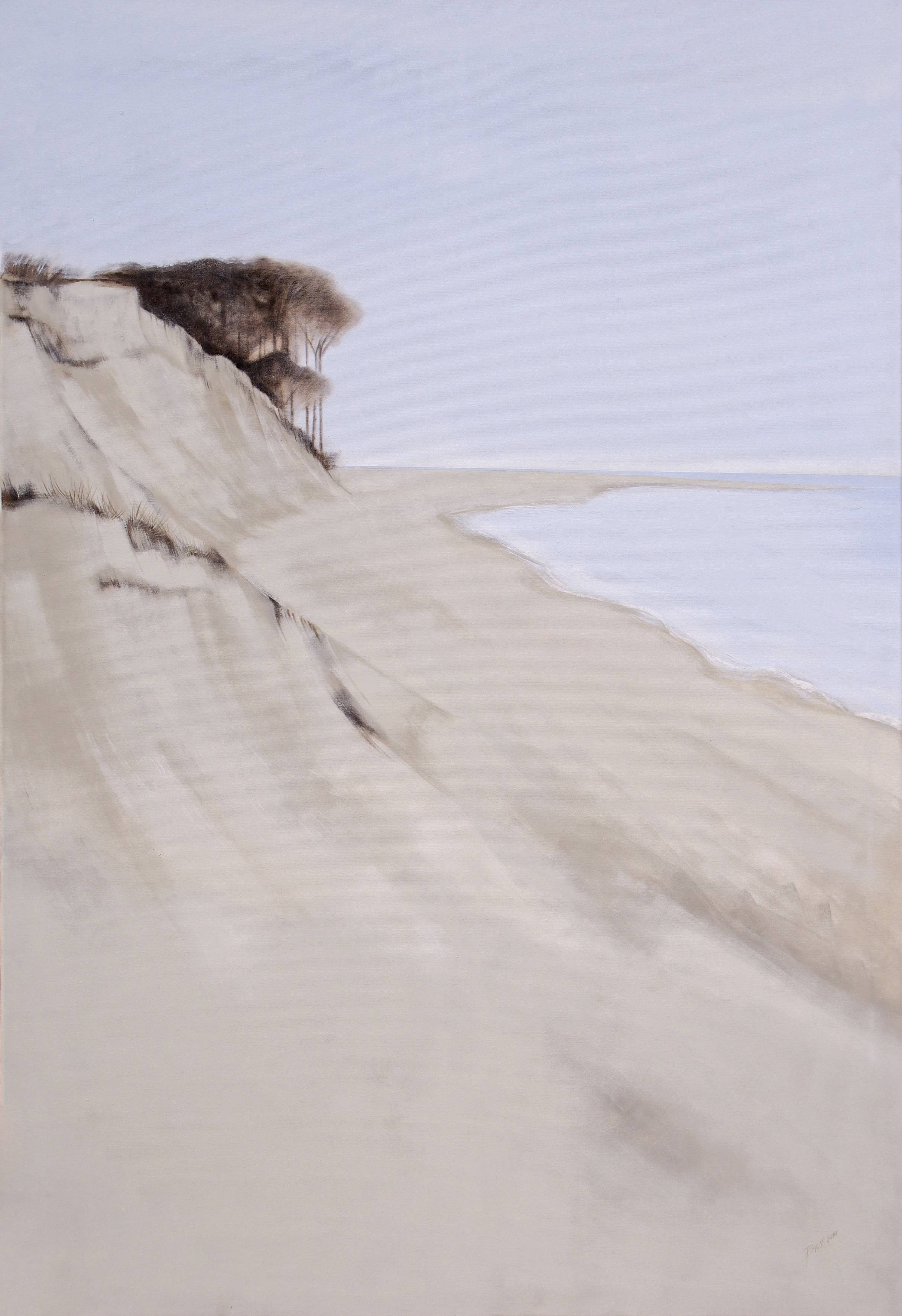Obraz przedstawia spokojny pejzaż nadmorski, gdzie delikatne odcienie szarości i beżu mieszają się harmonijnie. Horyzont przecięty jest linią drzew, które niczym strażnicy czuwają nad urwiskiem. Niebo i morze stapiają się w jednym punkcie, tworząc efekt nieskończoności. Kompozycja jest minimalistyczna, ale jednocześnie bogata w detale teksturalne. Powierzchnia piasku zdaje się falować, prowadząc wzrok ku wodzie. Atmosfera jest niezwykle spokojna, prawie sielska. Można by rzec, że to moment wyciszenia przed burzą, ale bez żadnego niepokoju. Obraz emanuje ciszą i spokojem, jak letni poranek, kiedy wszystko jeszcze śpi. Artysta użył delikatnych pociągnięć pędzla, które przypominają trochę watercolor style. Wszystko wydaje się niemal ulotne i efemeryczne. Obraz może budzić w odbiorcy tęsknotę za prostotą i naturą, której brak na co dzień. "Patrz, tam są drzewa!" – może zawołać dziecko z zachwytem. Dla mnie osobiście, ten widowiskowy pejzaż jest jak kojący szept, który mówi do mnie, żeby zwolnić i po prostu być.