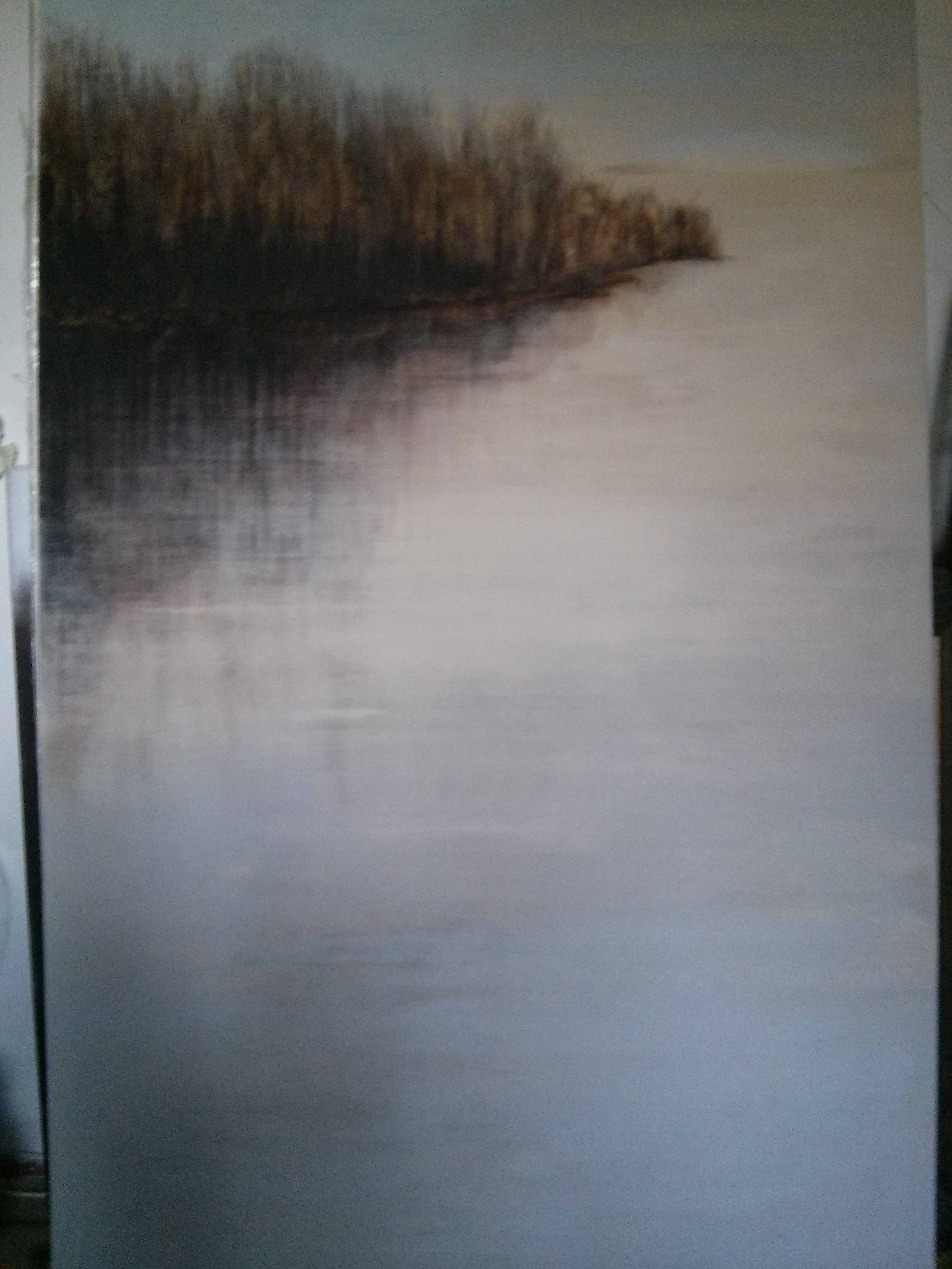 Ten obraz ukazuje melancholijny krajobraz, zdominowany przez przytłumione kolory, które przechodzą od ciepłych tonów brązu po zimne szarości i błękity. Na pierwszym planie widoczna jest spokojna tafla wody, która delikatnie odbija kiełkujące drzewka z brzegu. Kształty są zamglone i miękkie, co dodaje mistycyzmu kompozycji. Atmosfera obrazu jest niezwykle spokojna, wręcz dreamlike. Widz może poczuć ciszę i bezruch, jakby czas zatrzymał się na moment. Artysta stosuje technikę rozmycia, która przypomina impresjonistyczne podejście do oddawania ulotnych chwil. Kiedy patrzę na ten obraz, mam wrażenie, że zaraz usłyszę szum wiatru czy plusk wody. Tak jakby obraz ożywiał się na chwilę. Malowanie jest subtelne, nie ma tu krzykliwych detali, dzięki czemu uwaga skupia się na ogólnej harmonii dzieła. A co by powiedziało dziecko? "To wygląda jak zaczarowany las nad wodą!" To wywołuje uczucie tęsknoty, ale i błogości, jakbyśmy wracali do zapomnianego snu. Ta praca inspiruje do refleksji nad naturą i jej magią, sprawiając, że odbiorca przystaje na chwilę, aby zastanowić się nad pięknem świata. Artysta w magiczny sposób uchwycił moment spokoju, którego często nam brakuje.