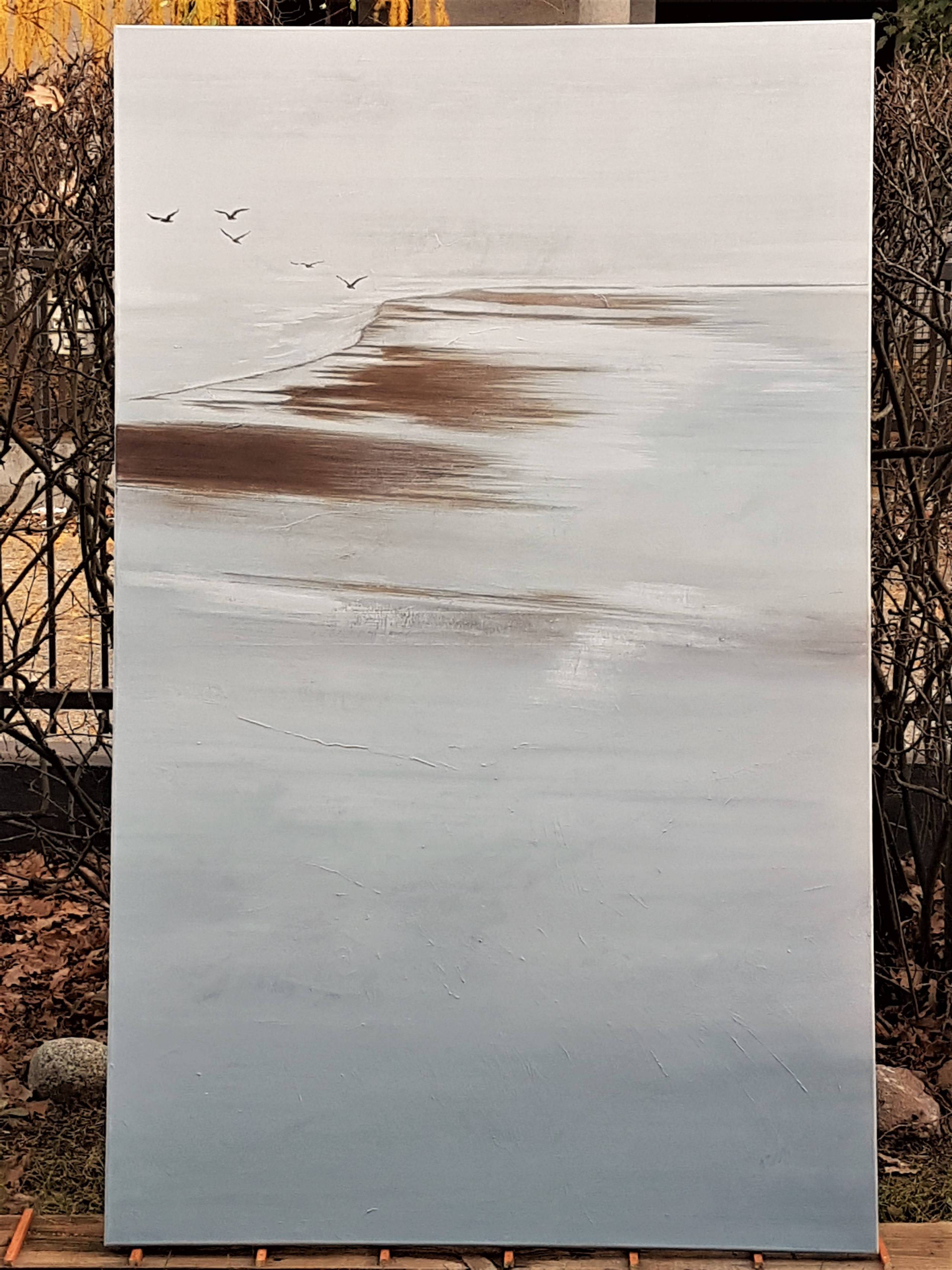Obraz ukazuje spokojny krajobraz z dominującymi odcieniami błękitu i brązu. Tło jest delikatnie rozmyte, co nadaje dziełu subtelność i pewną tajemniczość. Linie są miękkie, łagodnie płynące, przypominające senną mgłę nad jeziorem. Na horyzoncie leci kilka ptaków, nadając całości dynamiki i życia. Kompozycja wydaje się wyważona, harmonijna – no po prostu wow. Atmosfera obrazu jest niezwykle spokojna, jak cichy poranek na plaży. Można poczuć lekki powiew i usłyszeć śpiew ptaków. Styl artystyczny to minimalizm w czystej formie. Artysta używa delikatnych pociągnięć pędzlem, co sugeruje rękę doświadczoną, ale i otwartą na spontaniczność. Obraz wzbudza refleksję, zachęca do zatrzymania się i chwili kontemplacji. Można się zatopić w tym spokoju i poczuć pewnego rodzaju "stillness". Dla mnie to dzieło jak szept – takie ciche, a tak wyraziste. Chciałbym być tam, gdzie te ptaki lecą, po prostu iść przed siebie, bez pośpiechu. Wszystko tutaj jest takie proste, a jednak pełne głębi. Mega.