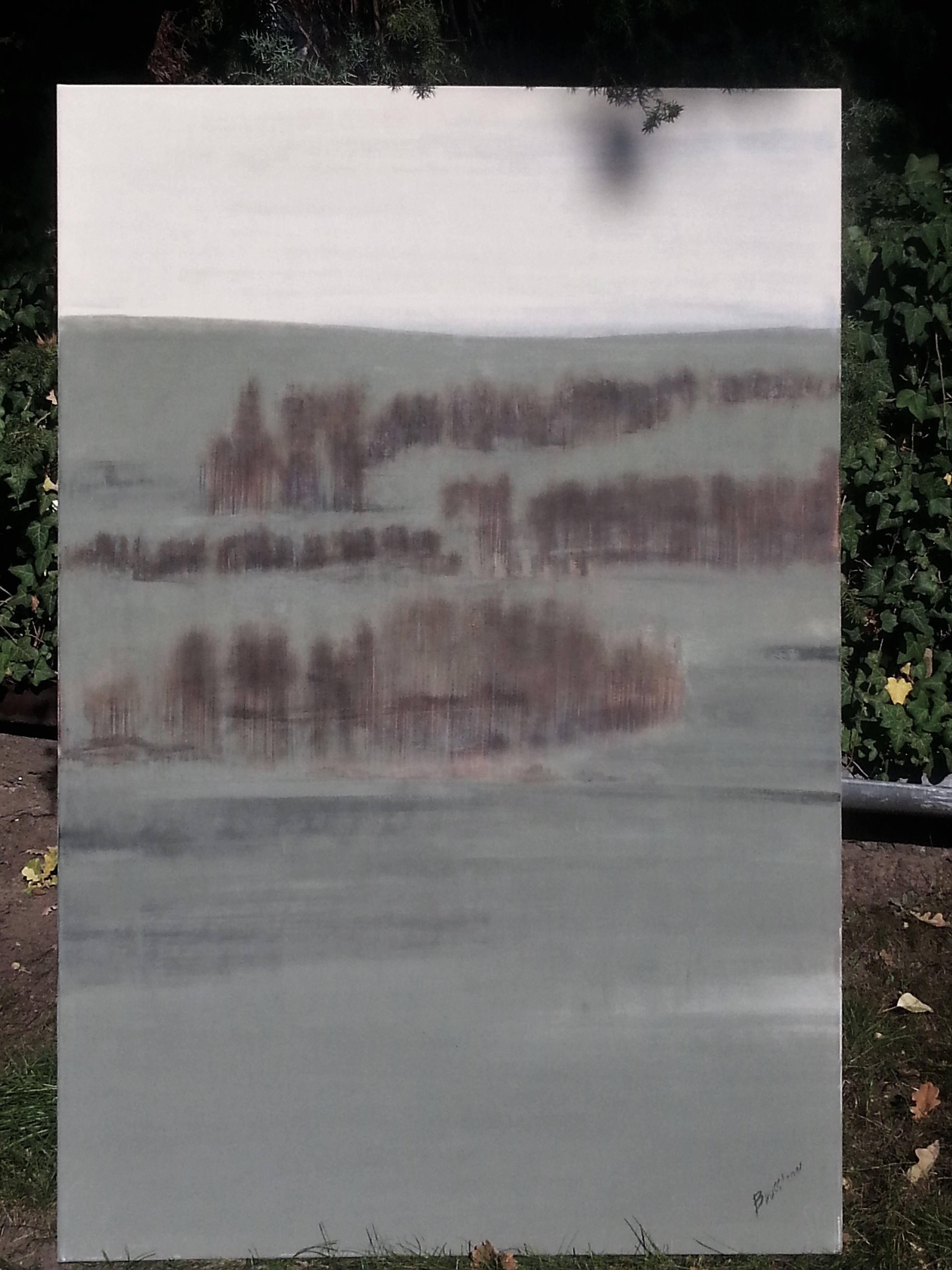 Na tym obrazie widzimy spokojny, rozmyty pejzaż, który emanuje atmosferą tajemnicy i wyciszenia. Dominują chłodne, stonowane kolory — szarości, zielenie oraz subtelne brązy. Krajobraz zbudowany jest z delikatnie zarysowanych drzew, które zdają się tańczyć na wietrze. Kompozycja jest bardzo harmonijna; elementy natury łagodnie przeplatają się z otoczeniem, tworząc efekt iluzorycznej głębi. Wszystko jest takie dreamy! Artysta zastosował technikę laserunkową, co nadaje obrazowi niezwykłej subtelności i delikatności. Przejrzystość warstw sprawia, że obraz oddaje wrażenie pływającego świata, jakby zawieszonego między snem a jawą. Nieco zamglona sceneria może budzić w odbiorcy uczucie nostalgii lub tęsknoty za nieuchwytnym. Wow, co za uczucie! Patrząc na ten pejzaż, można poczuć spokój, ale jednocześnie myślę o tym, co się kryje za linią horyzontu. Odbiorca może też postrzegać obraz jako symbol nieuchronnego przemijania czasu. To takie... jak to powiedzieć, pełne znaczeń. Kto by pomyślał, że coś tak ulotnego może wywołać tyle emocji! To trochę tak, jakby spojrzeć przez okno do innego świata.