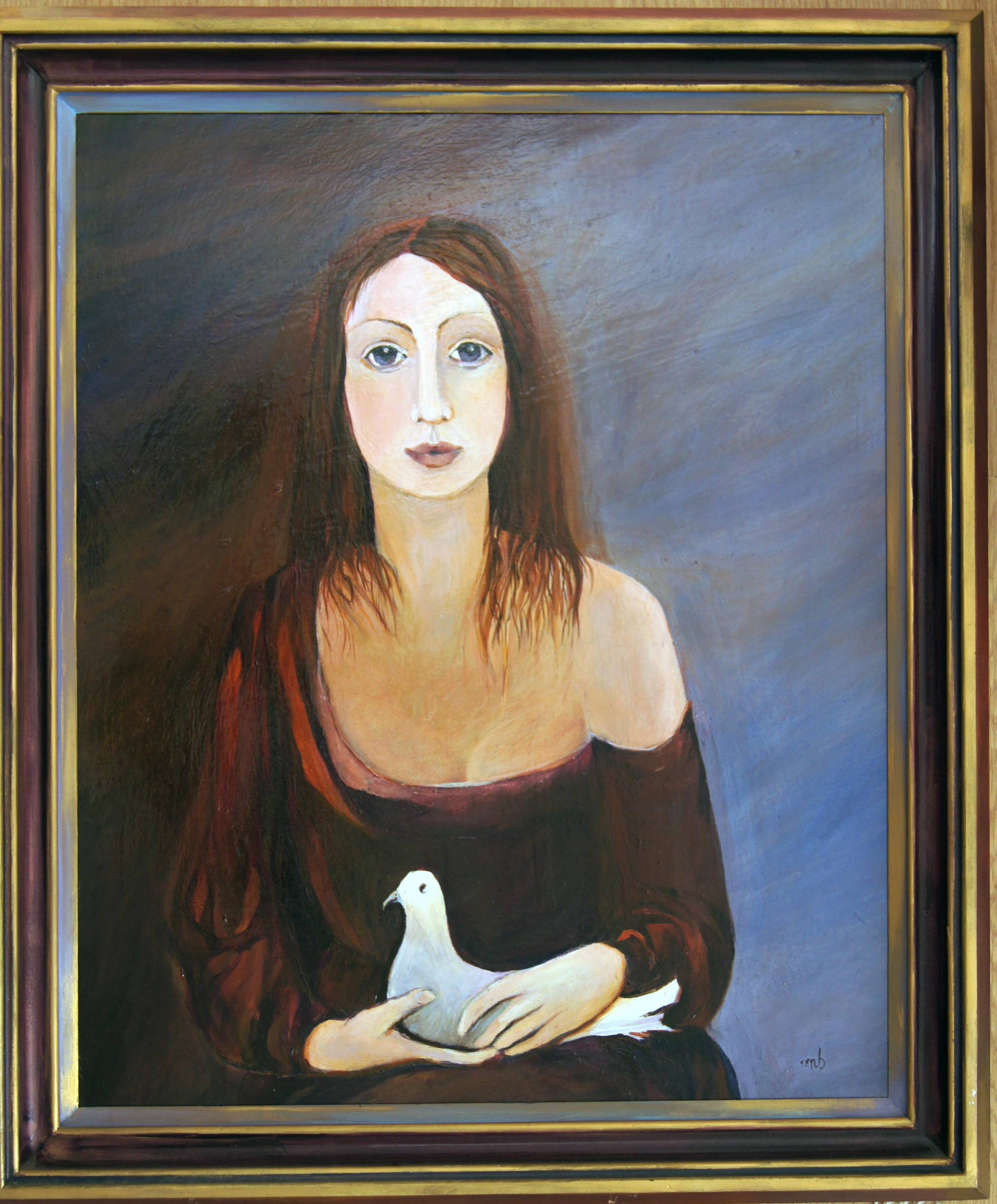 Postać kobieca z ptakiem , obraz był w wystawiany w 2005 roku na wystawie zbiorowej w Pałacu Sztuki w Krakowie pt"Kobieta i /mezczyzna