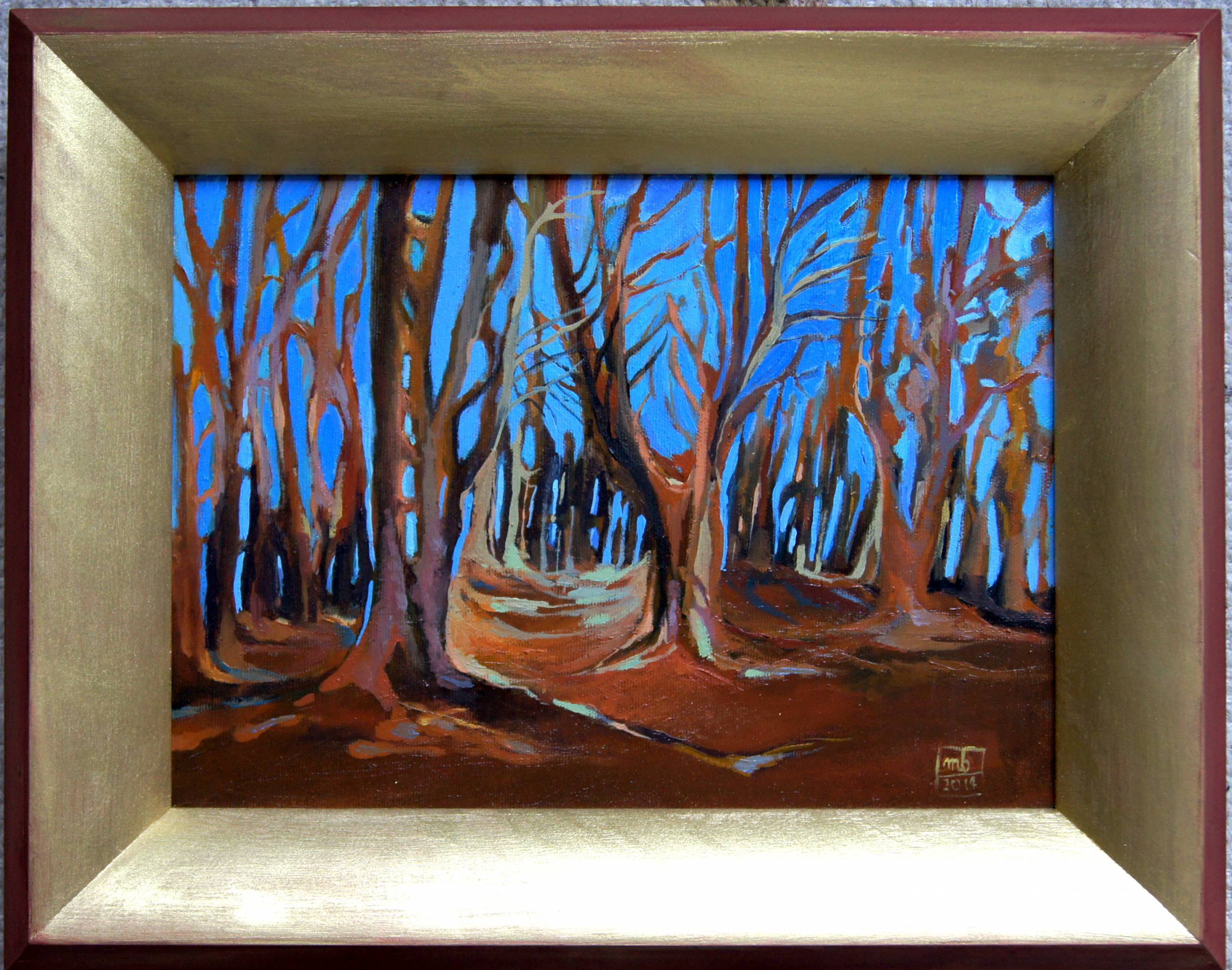 Obraz przedstawia magiczny las, gdzie błękitne niebo przeplata się z brunatnymi odcieniami pni drzew. Kompozycja przyciąga oko poprzez dynamiczne linie ukształtowane przez smukłe gałęzie, tworzące skomplikowaną sieć w górnej części dzieła. Artysta zastosował technikę impresjonistyczną, malując szybkie, energiczne pociągnięcia pędzla. Te kolory i kształty sprawiają, że czujesz, jakbyś był w środku bajki albo snu. Atmosfera obrazu jest spokojna, choć nieco tajemnicza. Może trochę jak w nowym świecie, gdzie wszystko jest możliwe. Ten las wygląda trochę jak z opowieści, w której każdy krok może zmienić twoje życie. Oglądając ten obraz, czujesz ciepło i nostalgia za miejscem, które może nigdy nie istniało. Wow, patrzę na to miejsce i chcę tam być, pobiegać, schować się! Jest tu coś z magii „childhood dreams”, co przypomina mi stare książki z ilustracjami. Patrząc na ten obraz, czujesz się spokojnie, ale też z odrobiną zachwytu.