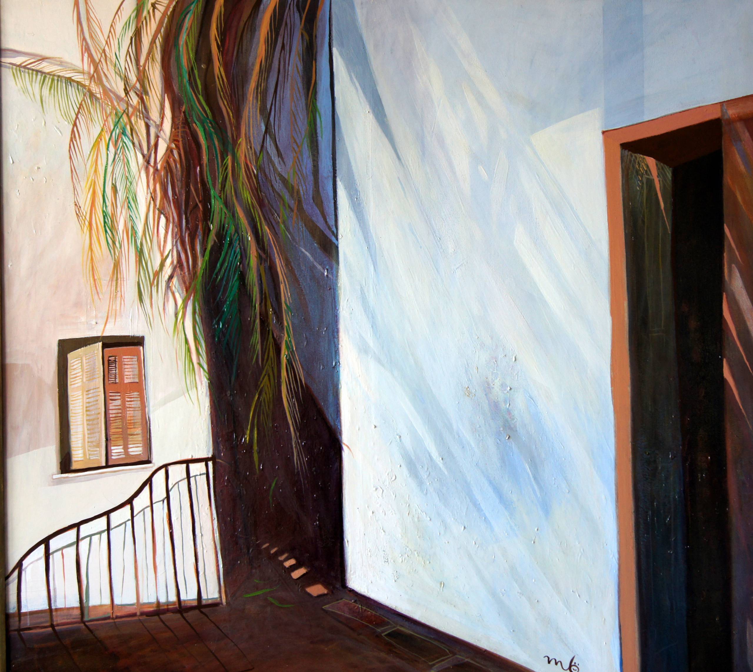 Obraz przedstawia fascynującą grę światła i cieni w miejskim zaułku. Ciepłe odcienie brązów i beżów przenikają się z chłodnym błękitem, tworząc harmonijną, a zarazem intrygującą kompozycję. Cienie rzucone na ścianę budynku przypominają kształty tańczących liści, które delikatnie poruszają się na wietrze. No i ten balkon - jakby zapraszał do chwili relaksu. Atmosfera obrazu jest spokojna, ale z odrobiną tajemnicy. Styl artysty wskazuje na impresjonistyczne podejście, gdzie technika światłocienia odgrywa kluczową rolę. Jest tu coś magicznego, co sprawia, że człowiek chciałby tam być, odkrywać ukryte zakamarki i czuć ciepło słońca na skórze. Taka nostalgia wzbiera w sercu, niemal słychać szelest liści. I to jest właśnie captivating, sposób w jaki artysta uchwycił tę ulotną chwilę. Mogę sobie wyobrazić, jak dziecko mówi: "Tam jest zaczarowany ogród!". Każdy gest pędzla zdaje się być przemyślany, jednocześnie pełen swobody. Dla mnie ten obraz to ucieczka do innego świata, gdzie czas płynie wolniej.