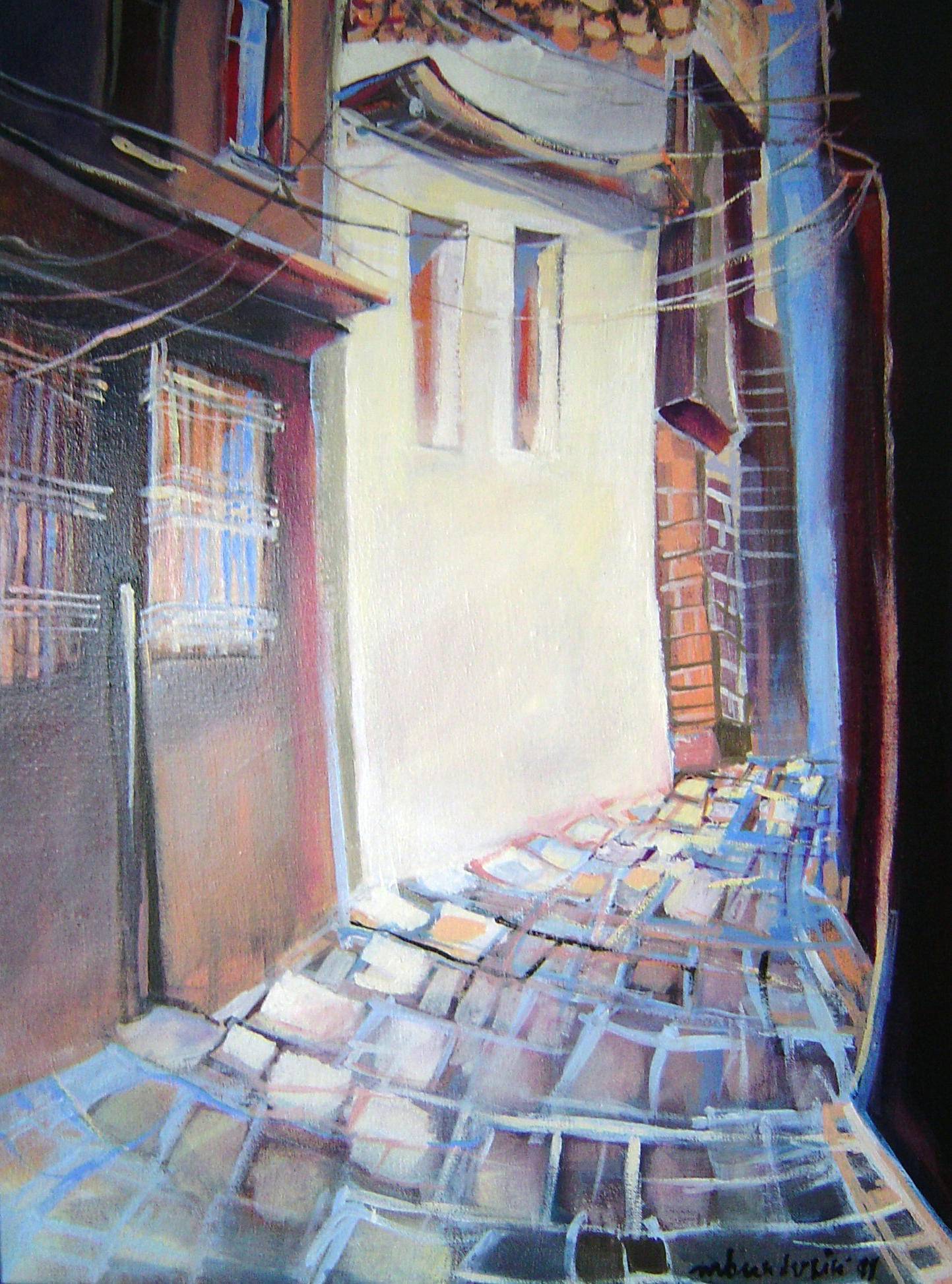 Obraz przedstawia wąską, nieco tajemniczą uliczkę, pełną dynamicznych linii i barw. Widać tu ciekawe połączenie ciepłych tonów brązu i ochry z chłodnym błękitem i fioletem, które tworzą kontrasty i ożywiają kompozycję. Budynki wydają się nieregularnie ukształtowane, jakby falowały na wietrze. To one dominują w przestrzeni, tworząc klimat nostalgii i lekkości. Od razu widać, że technika, którą artysta się posłużył, jest nieco impresjonistyczna – detale są mniej istotne niż ogólne wrażenie. Street art, tak to czuć. Z obrazu bije spokój, ale jednocześnie pewna dynamika ruchu. Może dlatego, że linie zdają się prowadzić oko w głąb uliczki, tworząc iluzję ruchu i głębi. Wyobrażam sobie, że do tego miejsca można dojść niespiesznie, wsłuchując się w szum liści. Czy to coś zwyczajnego, czy Magiczna kraina z książki? To trochę jak spacer po starych dzielnicach europejskich miast, gdzie każdy zakątek kryje swoją tajemnicę. Czuję, że ten obraz skłania do refleksji. Przywołuje wspomnienia dzieciństwa i odkrywania ukrytych zakamarków w miejskiej dżungli. Tak, można wracać do tego w nieskończoność. Idealnie oddaje chwilę zatrzymaną w czasie, jednocześnie pozwalając odbiorcy na własne, subiektywne interpretacje.