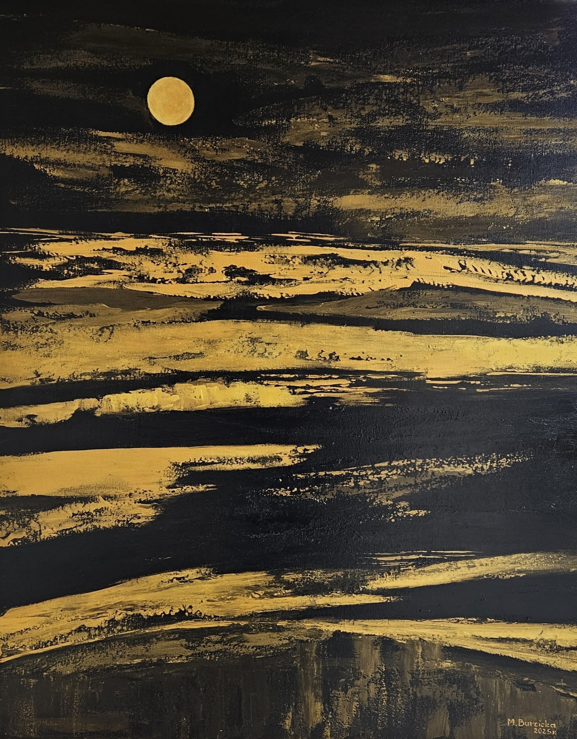Na obrazie dominuje głęboka czerń i złoto. U góry wisi okrągły księżyc jak moneta. Poniżej rozlewają się szerokie, poziome pasy farby, raz gładkie, raz poszarpane, jakby wiatr przejechał po mokrej powierzchni. Kompozycja jest spokojna, horyzontalna, ale faktura robi swoje i trochę miesza w głowie. To malarstwo gestu, z wyraźnym śladem pędzla i szpachli, miejscami niemal suchy pociągnięty. Atmosfera jest nocna, surowa, taka cisza aż dzwoni w uszach. Ja tu czuję samotność i jakiś upór, niby pustynia, niby morze. Ten złoty blask wygląda magic, serio. Księżyc jest jak kółko sera. Odbiorca może się zatrzymać, odetchnąć, albo poczuć lekki niepokój, bo ciemność jednak wciaga.