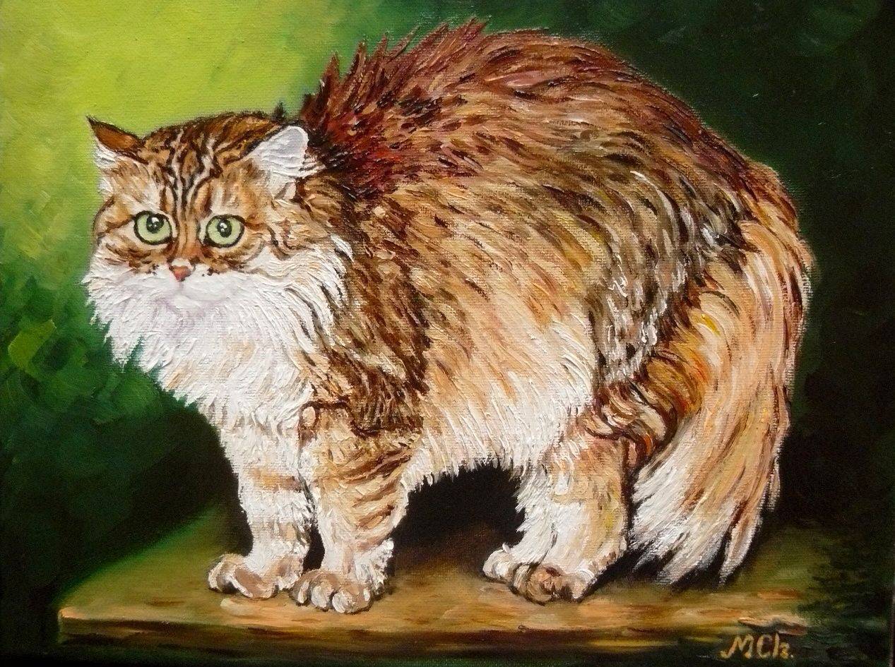 Obraz olejny malowany na podobraziu płóciennym o wymiarach 33x27.Obraz ma zamalowane boki. Przedstawia złotą kotkę syberyjską o imieniu Joko.