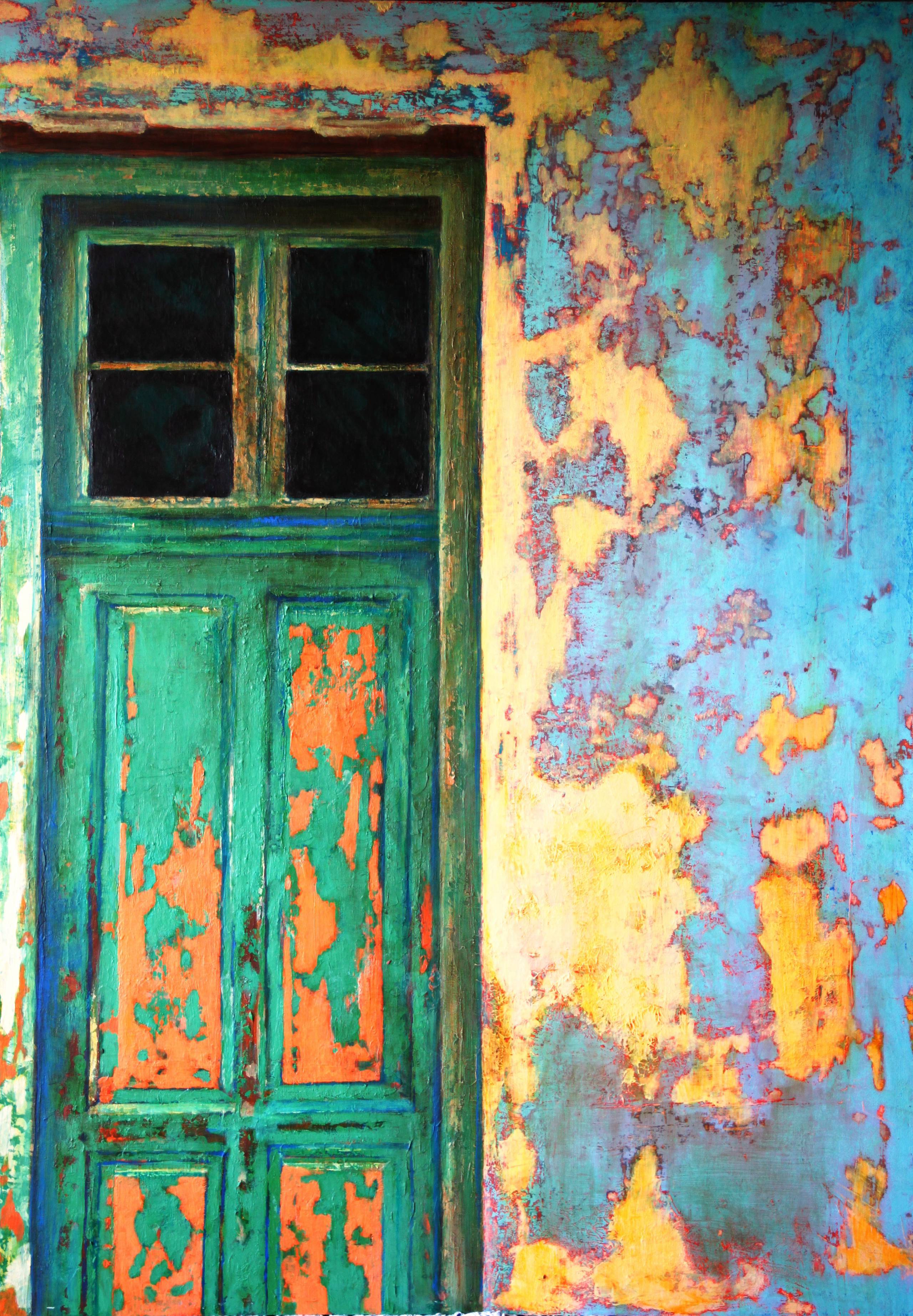 Na tym obrazie od razu rzucają się w oczy intensywne kolory. Zielona, mocno obdrapana drzwi wyraźnie kontrastują z jasnoniebieską i żółtą, nieco chropowatą ścianą. Artysta użył techniki malarstwa impasto, co uwydatnia fakturę, sprawiając, że farba zdaje się "wypływać" z płótna. Kompozycja jest lekko asymetryczna, co dodaje dynamiki i pewnej nieprzewidywalności. Wow! Jak na placu zabaw. Atmosfera obrazu jest nostalgiczna, trochę tajemnicza. Może to opuszczony dom? Może ma swoją magiczną opowieść? W mojej głowie rodzi się pytanie: co się za tymi drzwiami kryje? Styl artystyczny przywodzi na myśl impresjonizm, choć z nieco nowoczesnym twistem. Obraz może budzić uczucie zaciekawienia, ale też lekki niepokój. To dzieło przypomina mi, jak czas i natura potrafią odmieniać ludzkie twory. Jedno jest pewne – patrząc na niego, człowiek czuje, że podróżuje w czasie, dotykając starości, która jest piękna i melancholijna. It's captivating! Tak właśnie odbiorca zostaje na chwilę wciągnięty w wir przemyśleń.