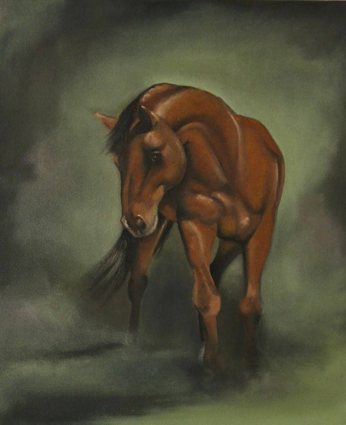 Obraz przedstawia konia o głęboko brązowej sierści, niemal wtapiającego się w ciemnozielone tło. Kompozycja jest zdominowana przez miękkie linie i łagodne przejścia kolorystyczne. Na pierwszy rzut oka, koń sprawia wrażenie zagubionego w tajemniczej, mgławicowej mgle. Ten kadr wywołuje pewien rodzaj melancholii i spokoju, a zarazem niepokój. Nabiera się ochoty, żeby powiedzieć: "Hej...!" Takie obrazy mają moc zatrzymywania widza na długo. Technika artystyczna przypomina styl impresjonistyczny, z naciskiem na grę cieni i świateł. Pędzlem artysta zdołał oddać nie tylko fizyczność konia, ale także ducha, a to jest dość cool. Patrząc na obraz, człowiek zaczyna się zastanawiać co ten koń widzi lub czuje. Może jest samotny? Może szuka przyjaciela? Ja bym zaliczył to do sztuki wyrażającej tęsknotę i poszukiwanie. Taki obraz może wywołać u niektórych widzów chęć refleksji nad swoim własnym życiem, przemijaniem czasu, a nawet odnalezieniem swojego miejsca w świecie. Można się rozmarzyć.