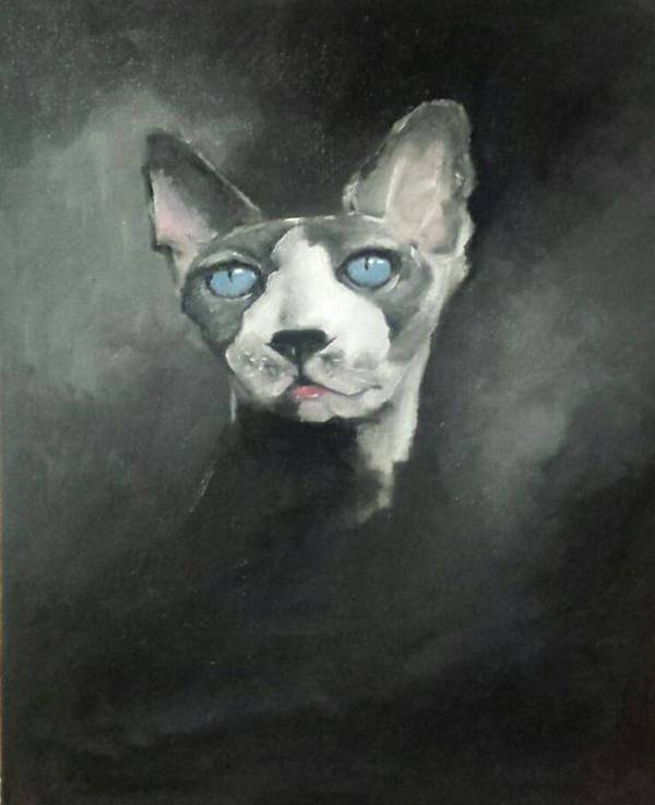 Obraz przedstawia kota wynurzającego się z mroku, co tworzy niemal magiczną aurę tajemniczości. Jego futro, w odcieniach szarości i bieli, kontrastuje z głęboką czernią tła. Najbardziej przyciągają wzrok błękitne oczy, które zdają się przenikać odbiorcę i przywołują skojarzenia z oceanem. Uśmiech kota jest subtelny, co dodaje mu odrobiny zadziorności i charakteru. Atmosfera obrazu jest melancholijna, ale też enigmatyczna. Wywołuje uczucie, jakby kot spoglądał poprzez czas i przestrzeń, zachęcając do zagadkowej rozmowy z widzem. Artysta stosuje technikę chiaroscuro, by skupić uwagę na twarzy zwierzęcia, jednocześnie pozostawiając resztę w cieniu. Ten portret może wywoływać różne emocje. Niektórzy mogą poczuć spokój, inni lekki niepokój, jakby ten kot wiedział coś, czego my nie wiemy. Wow, on chyba wie wszystko! To jeden z tych obrazów, które mówisz "amazing" i nie wiesz, czy to przez wykonanie, czy przez wrażenie, jakie zostawia. Styl malarski jest surowy, z widocznymi pociągnięciami pędzla, co nadaje dziełu dynamiki i życia. To nie jest idealnie gładki obraz. Wygląda bardziej jak spontaniczna artystyczna ekspresja niż precyzyjnie wykonana praca. Taki kot to coś więcej niż zwykły obraz. To zagadka, to opowieść, którą każdy widz może zinterpretować na swój sposób.