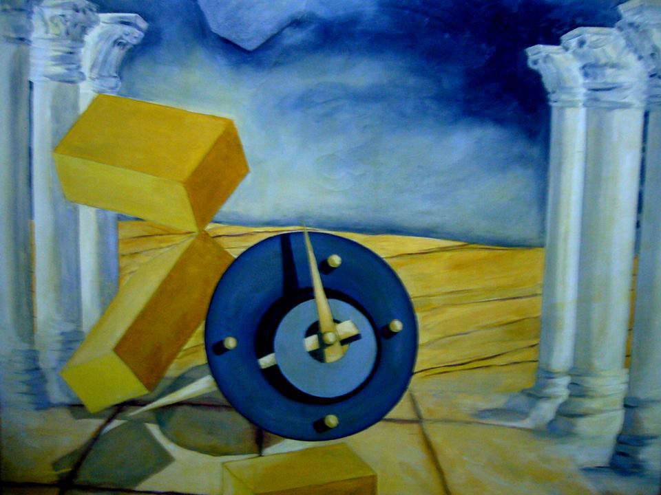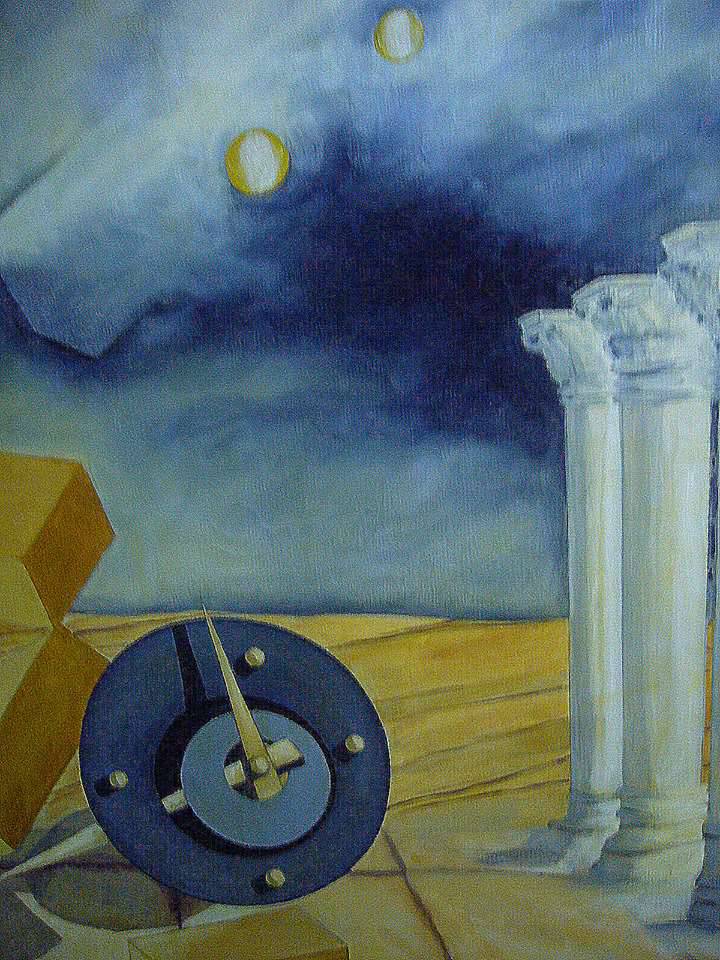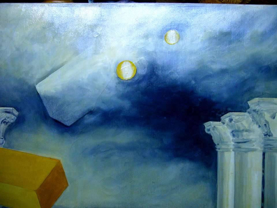 Obraz przedstawia surrealistyczny ,antyczny pejzaż