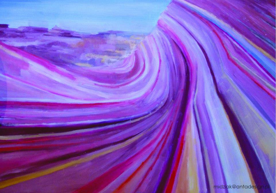 Na obrazie dominują intensywne odcienie fioletu i różu, tworząc wirujące, falujące linie, które przypominają naturalne formacje skalne. Dynamiczna kompozycja przyciąga wzrok od lewego dolnego rogu aż po prawy górny, prowadząc wzrok wzdłuż barwnych krzywizn. Miejscami wydaje się, jakby te kolory tańczyły na powierzchni, tworząc ruch i energię. Nastrój obrazu jest pełen harmonii i spokoju, a jednocześnie emanuje pewną dzikością i żywiołowością. Technika artystyczna, być może przypominająca impasto, dodaje faktury całemu dziełu, co czyni je jeszcze bardziej pociągającym. "Wow, jak karuzela!", mogłoby powiedzieć dziecko patrząc na ten obraz. Styl jest na tyle abstrakcyjny, że daje wolną rękę do interpretacji. Ten swirl of colors sprawia, że odbiorca czuje się jakby był częścią wymarzonego pejzażu. Obraz wyzwala w nas zarówno zachwyt, jak i pewną tęsknotę za czymś nieokreślonym, niewypowiedzianym. To sztuka, która łączy w sobie chaos i porządek w jednym.