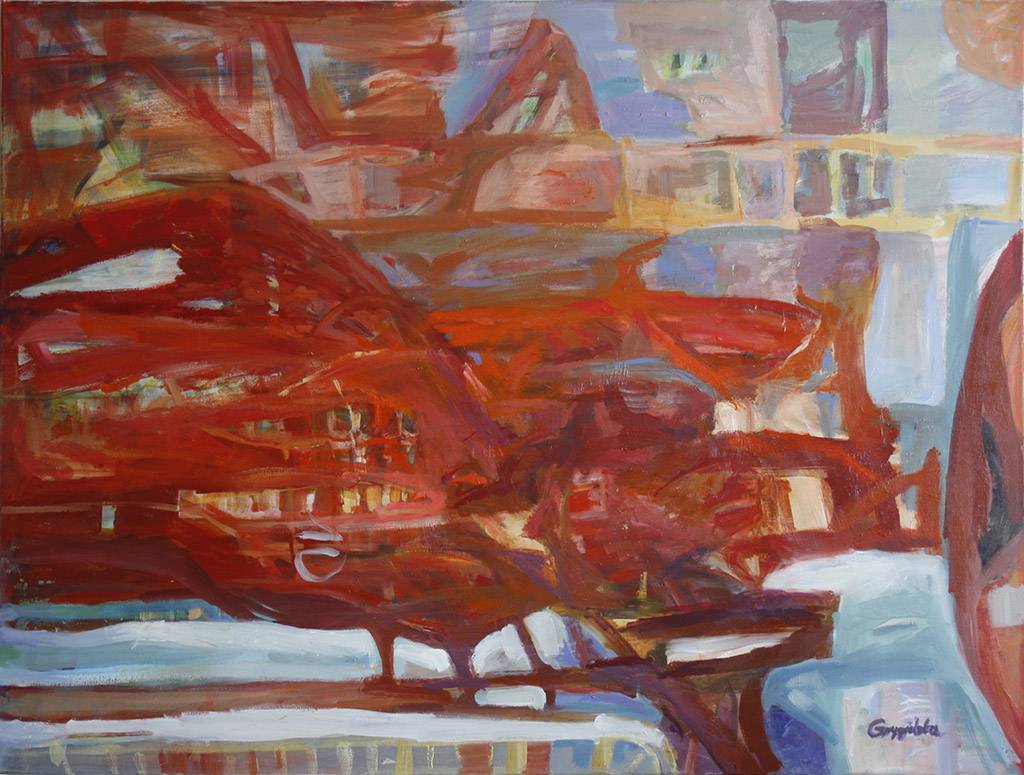 Na tym dynamicznym obrazie dominują ciepłe odcienie czerwieni i pomarańczu przeplatane chłodnymi nutami błękitu. Kształty są abstrakcyjne, nieco zawirowane, niczym tajemniczy wir emocji. Kompozycja obrazu przykuwa spojrzenie, prowadzi wzrok w prawo, a potem znowu w lewo, jakbyśmy wsiedli na roller coaster. Atmosfera jest pełna energii, niemal słychać szelest barw. Styl artystyczny malarza przypomina ekspresjonizm abstrakcyjny, z mnóstwem śmiałych pociągnięć pędzla. Technika nakładania kolorów jest swobodna, a całość pulsuje życiem. Obraz może wywołać w widzu mieszane uczucia – od zachwytu po zadumę. Myślę, że to trochę magiczne! Widz mógłby się zatracić w tych kolorach, szukając własnych interpretacji. A maybe to właśnie siła tego obrazu? Dzieło przemawia własnym językiem, któremu nie potrzebne słowa.