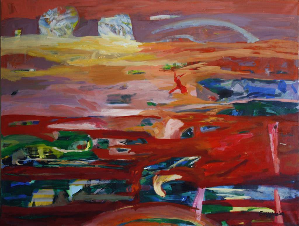 Obraz emanuje wirującą eksplozją kolorów, gdzie ciepłe odcienie czerwieni i pomarańczy dominują nad resztą kompozycji. Kształty są abstrakcyjne i dynamiczne, sprawiając, że całość wydaje się w ruchu jakby nie mogła się zatrzymać. W centralnej części obrazu można dostrzec smugi żółci i zieleni, które rozlewają się jak rzeka przez krajobraz. Tło jest mieszanką delikatnych odcieni niebieskiego i fioletu, wprowadzając atmosferę tajemnicy i niepokoju. Nastrój dzieła jest jednocześnie energetyczny i nieco chaotyczny. Artysta użył pociągnięć pędzla, które są szybkie i nieco niedbałe, nadając całości wyrazistości. Technika ta sprawia, że obraz jest niemal tactile, jakby można było go dotknąć i poczuć ruch pod palcami. To sprawia, że odbiorca staje się częścią obrazu, wciągnięty w wir emocji i kolorowych niespodzianek. Obraz stwarza warunki do różnorodnych interpretacji. Jedni mogą widzieć w nim wschód słońca nad abstrakcyjnym pejzażem, inni – wyraz wewnętrznych emocji artysty w czasie tworzenia. Jak by napisało dziecko: „To obraz jak bajka, gdzie wszystko się rusza i zmienia”. Takie połączenie dynamicznych form z eksplozją barw tworzy unikalny spektakl, który na długo zapada w pamięci. To jest truly fascinating experience, która rozgrzewa zmysły i pobudza wyobraźnię. A ja widzę w nim wir życia, który nigdy nie ustaje.