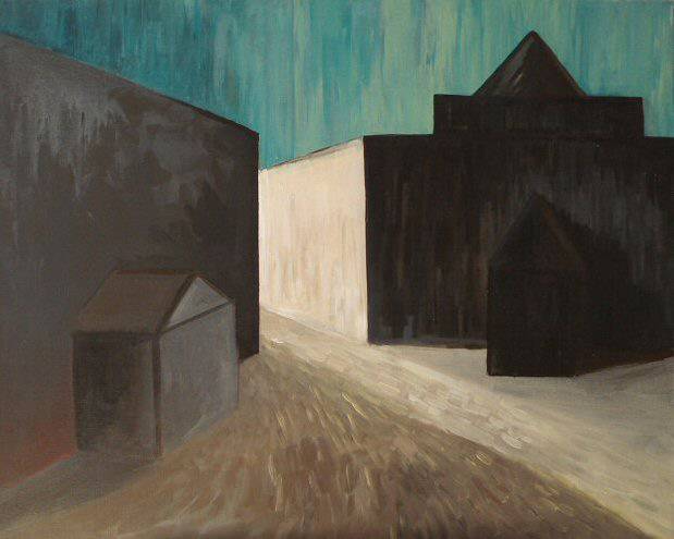 Obraz przedstawia tajemniczą uliczkę, zanurzoną w odcieniach przygaszonego błękitu i głębokiej czerni. Bryły budynków mają uproszczone, geometryczne formy, co dodaje dziełu pewnej tajemniczości. Dominują ciemne kształty, które kontrastują z jasnym, kremowym światłem padającym na drogę, tworząc intrygującą grę cieni. Atmosfera jest pełna niepokoju, a całe dzieło zdaje się emanuować pewnym chłodem i dystansem. Styl artystyczny jest minimalistyczny, z wyraźnym naciskiem na formę i kolor. Obraz wywołuje uczucie osamotnienia, może nawet pewnego zagubienia w miejskiej dżungli. Te proste kształty i ciemne kolory mogą budzić w odbiorcy refleksję nad samotnością w tłumie. Techniką artystyczną tu wykorzystaną jest impasto, co to daje teksturę i głębię. There's something haunting about the simplicity of it. Patrząc na to miejsce, można mieć wrażenie, że czas się zatrzymał, a świat wokół zamarł w bezruchu. To miejsce wygląda jak z bajki, mówiłby 7-latek, bawiąc się słowami. Ten obraz to jakby zaproszenie do refleksji nad drogą, którą idziemy. Czy byłoby inaczej, gdyby światło padło z innej strony? Emocje, które budzi, mogą być różnorodne: od ciekawości po niepewność. Patrząc na ten obraz, przypomina mi się chwila spokoju po burzy – niby wszystko w porządku, ale jednak coś wisi w powietrzu.