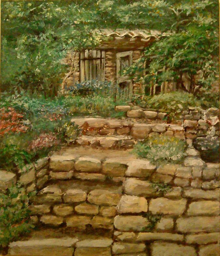 Obraz emanuje spokojnym urokiem wiejskiego zakątka. Kompozycja jest pełna zieleni, z wyraźnymi kontrastami kolorów: ciemna zieleń drzew i krzewów miesza się z ciepłymi, ziemistymi tonacjami kamieni. Układ kamieni tworzy przestrzeń schodów prowadzących do małego, ukrytego wśród roślinności domku. Nastrój obrazu jest spokojny i nostalgiczny, jakby czas zatrzymał się w tym magicznym miejscu. Artysta użył techniki impasto, nakładając farbę warstwami, co daje teksturę i poczucie głębi. Grube pociągnięcia pędzla dają wrażenie trójwymiarowości, podkreślając organiczny charakter natury. Obraz przypomina dziecięcą radość odkrywania sekretnych ogrodów. Kurde, aż chciałoby się tam być! Obraz wywołuje przyjemne emocje. Można niemal usłyszeć szum liści i poczuć delikatny wiatr na twarzy. Czy widz czuje, jak natura go obejmuje? To miejsce to tajna baza elfów! Tak by powiedział mały odkrywca. Spokój, natura i ciche rytmy natury - to essence tego dzieła. Refleksje na temat uciekającego czasu i piękna prostoty przenikają każdą część tego obrazu, budząc w widzu tęsknotę za dawnymi dniami.