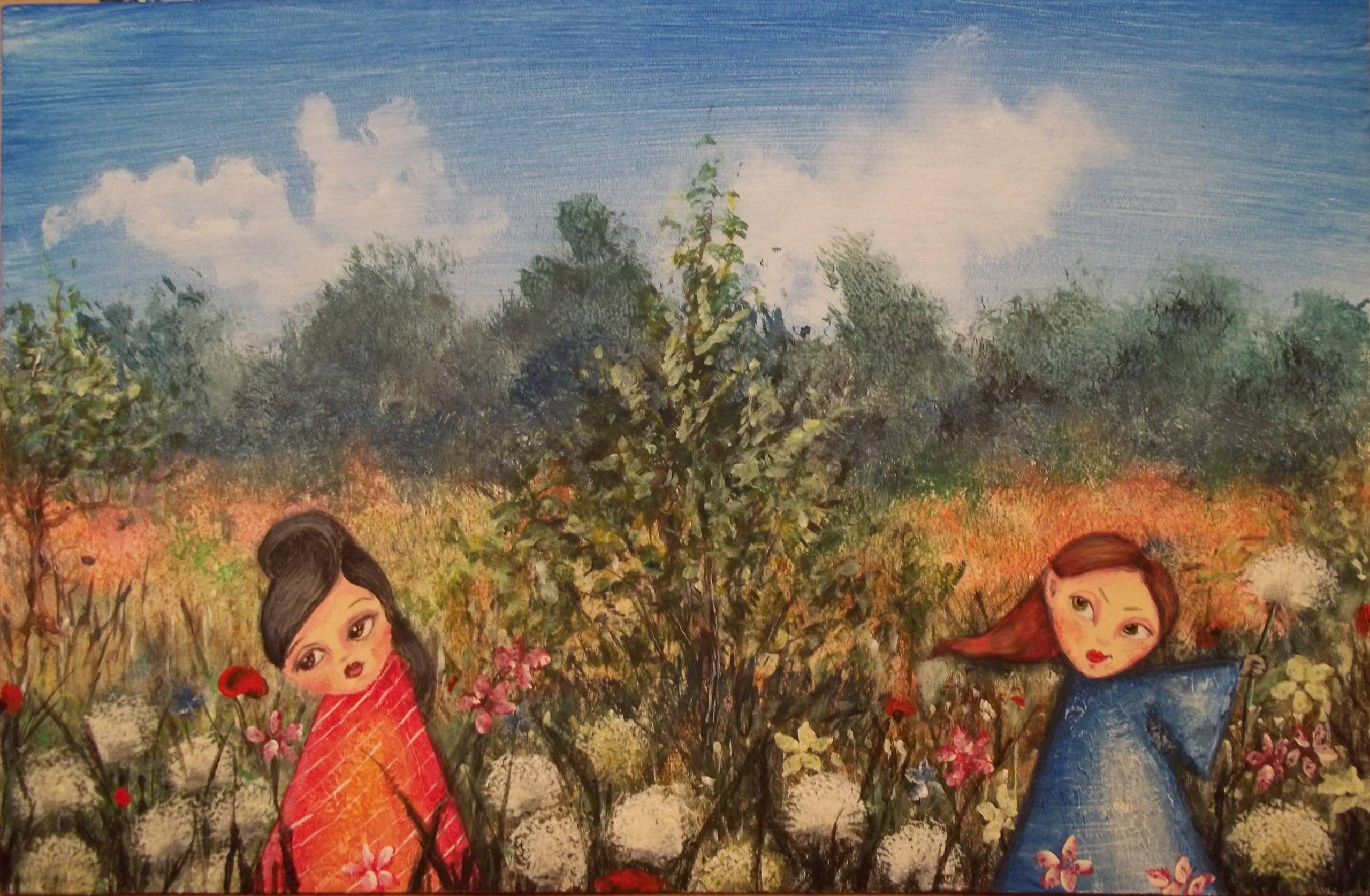 Obraz ukazuje dwie postacie w bajkowym otoczeniu. Z lewej strony jest dziewczynka w czerwonym stroju, z delikatnym uśmiechem. Obok niej widnieje druga postać, ubrana w niebieską szatę, ze wzrokiem zwróconym w stronę pierwszej dziewczynki. Obie stoją wśród kwitnącej łąki pełnej polnych kwiatów, które wprowadzają do obrazu żywe kolory – czerwienie, różne odcienie zieleni i błękitów. Tło stanowi rozmyta linia drzew i błękitne niebo z kilkoma puszystymi chmurami. Obraz emanuje spokojem i bajkową atmosferą, jakby zapraszał widza do świata dziecięcej wyobraźni. Artysta zastosował technikę mieszanych pociągnięć pędzla, które dodają mu tekstury i głębi. Jest tak, jakby świat wokół wyrastał z fantazji, trochę dream-like, z odrobiną tajemnicy w powietrzu. Dla odbiorcy, obraz może być pełen nostalgii i wspomnień z dzieciństwa, kiedy świat był pełen magii i cudów. Czy te dziewczynki to przyjaciółki odkrywające swój magiczny ogród, a może to małe wróżki bawiące się na łące? Nie wiem, ale wygląda fajnie! Kompozycja, chociaż prosta, jest niezwykle ujmująca. Pod wpływem tej spokojnej scenerii, człowiek może na chwilę zapomnieć o pośpiechu dnia codziennego i zatracić się w tym malarskim "wonderland".
