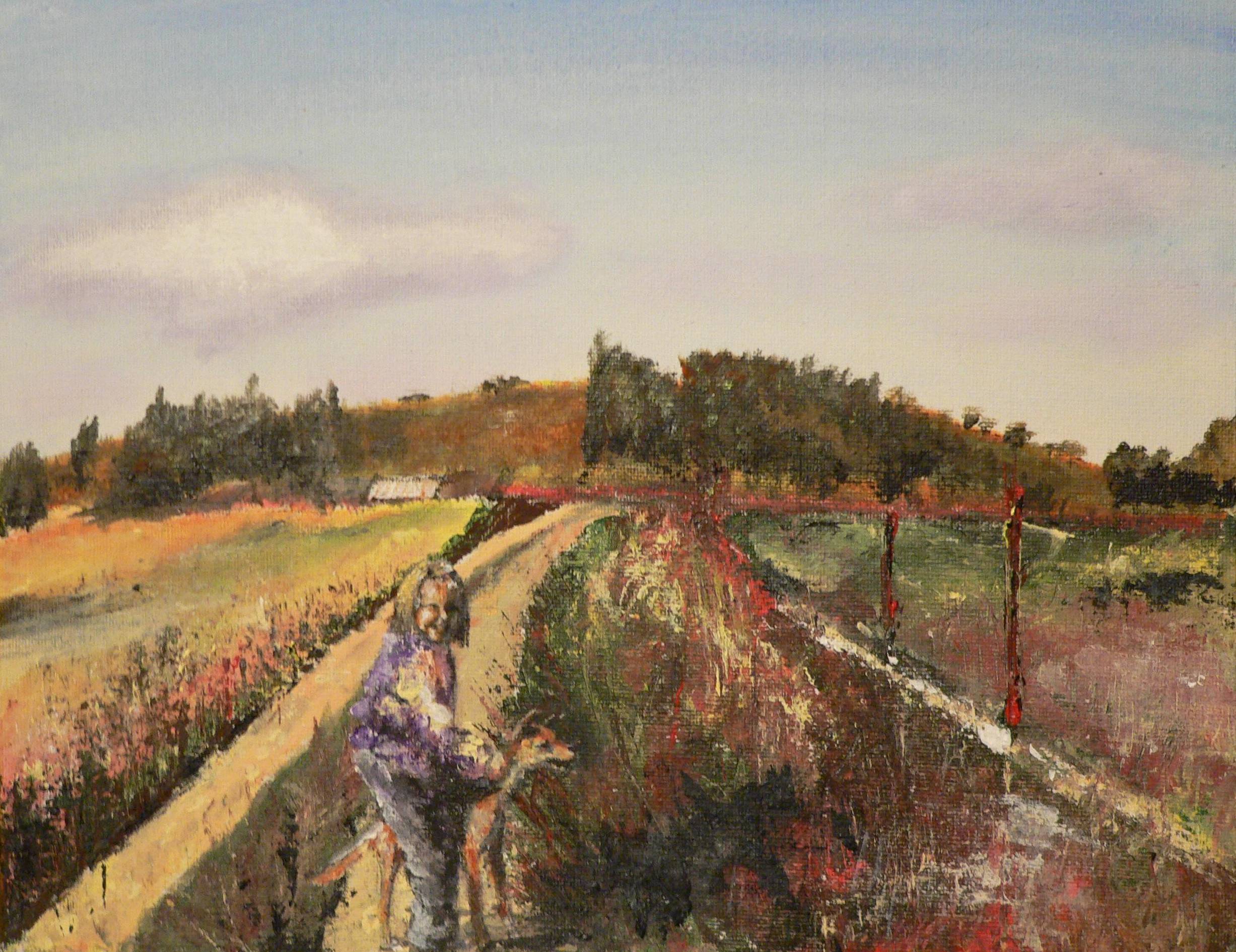Obraz przedstawia spokojną, wiejską scenę, która aż emanuje dawną, nostalgiczną atmosferą. Barwy są delikatne, z przewagą ciepłych odcieni zieleni, brązów i czerwieni. Jasne niebo z białymi chmurami dodaje lekkości i spokoju. Na pierwszym planie widać postać człowieka z psem. Wygląda to, jakby spacerowali ścieżką wśród pól. Kompozycja jest harmonijna, a linie prowadzą wzrok w stronę odległego horyzontu. Artysta zastosował impast, dzięki czemu tekstura obrazu jest wyraźnie wyczuwalna. Technika ta dodaje głębi, a użycie światła i cienia sprawia, że całość ma w sobie coś magic. Obraz wywołuje uczucie melancholii i radości jednocześnie. Może przywodzić na myśl wspomnienia z dzieciństwa, kiedy wszystko było prostsze i wolniejsze. Wyobrażam sobie, jak tam pachnie świeżo skoszona trawa. Czuję, że artysta chciał uchwycić moment zatrzymany w czasie. Światło i ciepłe kolory dają poczucie bezpieczeństwa. Moja siostra by powiedziała: "Tam jest piesek!" Patrząc na ten obraz, można się zatopić w marzeniach o beztroskich dniach spędzonych na wsi.