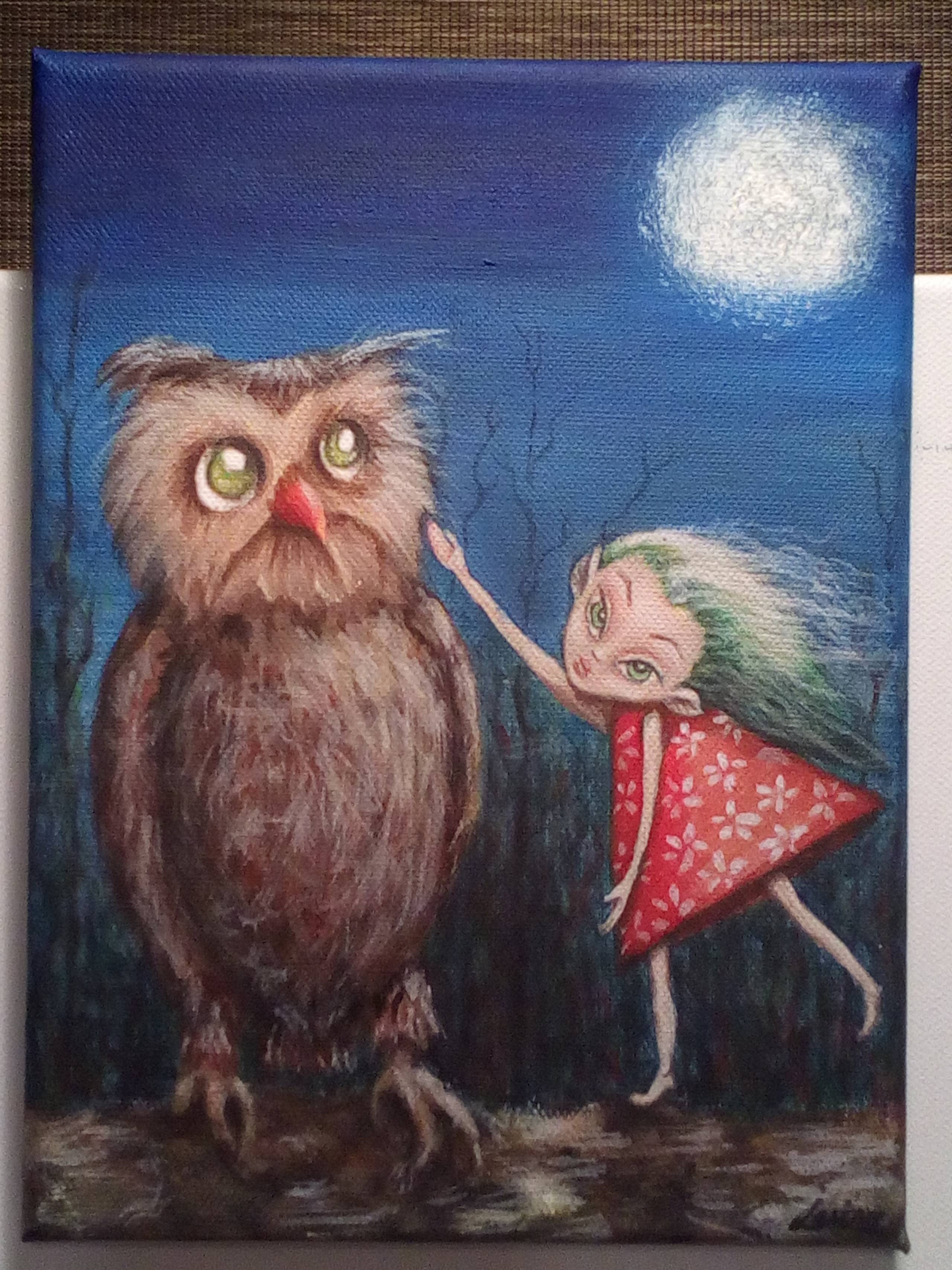 Obraz ukazuje magiczną scenę, gdzie w centrum widzimy ogromną sowę i dziewczynkę w czerwonej sukience, która dotyka jej piór. Tło zanurzone jest w głębokim niebieskim kolorze, z jaśniejącym księżycem, który dodaje tajemniczości całemu dziełu. Gałęzie drzew majaczą w tle jak duchy, znakując cichy las. Kompozycja balansuje na granicy snu i rzeczywistości, przyciągając wzrok swoimi organicznymi kształtami. Nasza dziewczynka ma zielone włosy, co czyni ją postacią z bajki, a w tym połączeniu z sową widać coś z fantastycznej opowieści. Jej spojrzenie pełne jest ciekawości, odrobinę zaczepne, trochę jak gdyby chciała sprawdzić, czy sowa jest prawdziwa. Widać tu wyraźne nawiązanie do techniki impresjonistycznej z naciskiem na ruch pędza, co dodaje obrazowi dynamiki i życia. To dzieło emanuje spokojem, ale w jego tle czai się niewypowiedziana tajemnica. Obraz mógłby wzbudzać w widzu uczucia nostalgii za dzieciństwem, kiedy to wszystko wydaje się możliwe. Myślę, że każdy, kto na niego spojrzy, natychmiast zapragnie zanurkować w jego atmosferze „magical night”. Dla mnie to podróż przez czas i przestrzeń do miejsca, gdzie marzenia nabierają kształtu. Kto wie, może one naprawdę istnieją, tylko musimy je odkryć? Sowy są mądre!