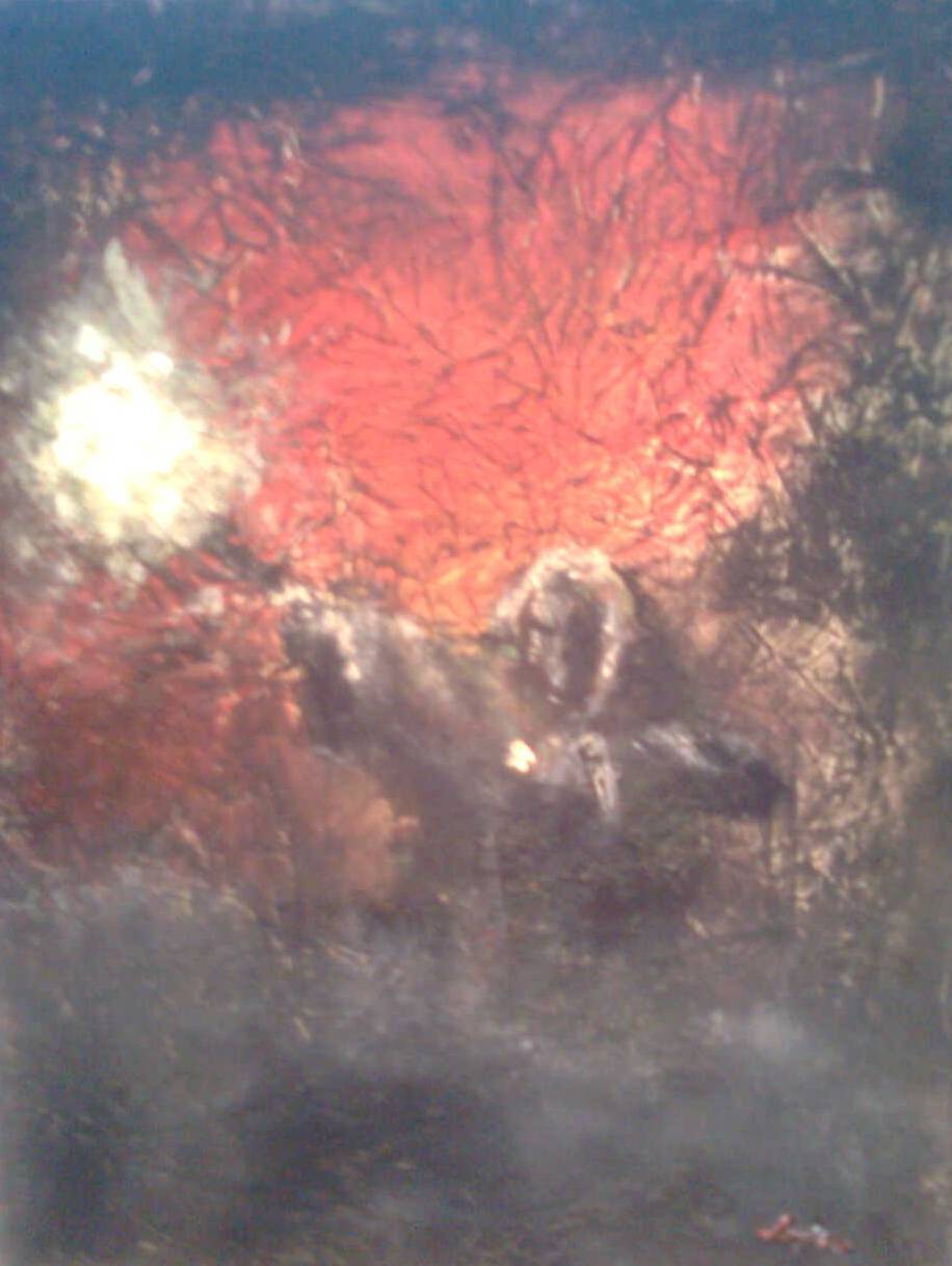 Obraz emanuje intensywnym, wręcz ognistym ciepłem dzięki dominacji czerwieni i pomarańczy. Barwy zdają się wylewać z płótna, tworząc fascynujący chaos, który jednocześnie przyciąga i pochłania wzrok. Widoczne są ciemniejsze smugi i plamy, nadając całości dramatyczny kontrast. Kształty są nieokreślone, niemal abstrakcyjne, co przecież działa na wyobraźnię. W centrum widnieje jasna plama, jakby blask słońca przebijał się przez burzowe chmury. Atmosfera obrazu jest pełna napięcia. Przypomina to nieco widok zza okna podczas intensywnej burzy, gdzie kolory nieba mieszają się w nieprzewidywalny sposób. Nastrój jest nieco melanchijny, ale i pełen energii – jakby coś za chwilę miało się wydarzyć. Czuć zapach deszczu i ciepło słońca jednocześnie. Styl artysty można określić jako ekspresjonistyczny, gdzie emocje wyrażone są poprzez swobodne pociągnięcia pędzla i intensywne kolory. Techniki użyte w obrazie powodują, że wszystko zdaje się migotać, pulsować. Obraz budzi emocje. Może przypominać o letnich, emocjonalnych wieczorach pełnych skrajności. Albo o chwilach introspekcji, kiedy wszystko dookoła jest w chaosie, a wewnątrz człowiek szuka spokoju. "Wow, to jest jak wielki wybuch światła" - pomyślało dziecko, patrząc na tę intensywność kolorów. Dla mnie osobiście, ten obraz wywołuje uczucie takiego "burst of life", gdzie czuć każdy piksel intensywności i życia. Obraz mówi: spójrz na mnie, pozwól ponieść się emocjom.