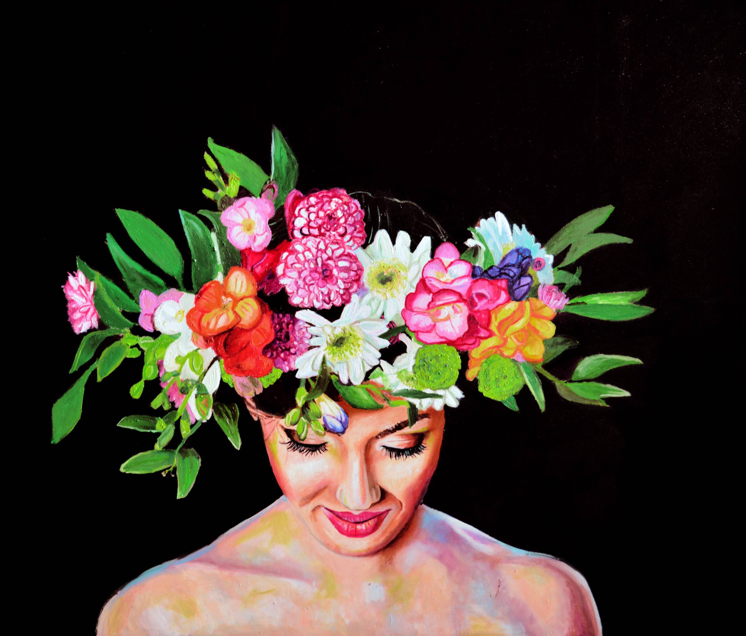 Obraz przedstawia kobietę z wieńcem kwiatów na głowie, wyróżniający się intensywnością kolorów na tle głębokiej czerni. Kwiaty są pełne życia, mieniąc się różnorodnością – czerwienie, żółcie, zielenie i biel komponują się w harmonijną całość. Ta kompozycja przywodzi na myśl wiosenną lekkość i świeżość. Postać kobiety, z subtelnym uśmiechem, emanuje spokojem i radością. Patrząc na nią, ma się wrażenie, że zaraz usłyszymy śpiew ptaków albo plusk wody – taka to "magic touch" natury. Styl artystyczny jest realistyczny, ale z nutą fantazji. Detale twarzy są subtelnie oddane, a technika malarska – prawdopodobnie akrylowa – pozwala na uzyskanie żywych barw i wyrazistych konturów. Duch obrazu może budzić w odbiorcy uczucie nostalgi za chwilami pełnymi wspaniałości przyrody. Dziecko powiedziałoby: "Ona jest jak kwiatowa księżniczka!" I coś w tym jest. Całość tchnie pozytywnością, przypominając o prostocie piękna. Ta praca ma w sobie coś, co zachęca do zatrzymania się na chwilę i podziwiania szczegółów. Osobiście czuję, że ten obraz to hołd dla natury i jej nieskończonego uroku.